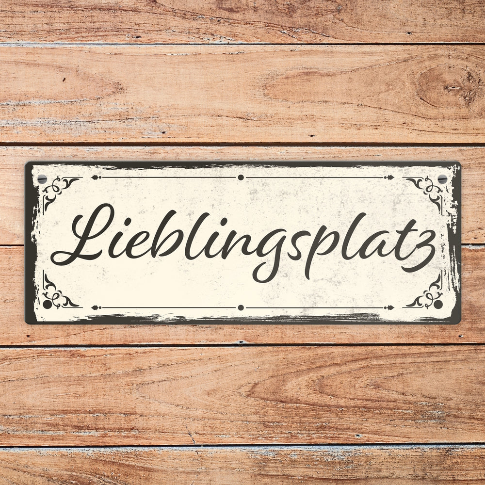 Metallschild mit schönem Design - Lieblingsplatz im rustikalen Stil in Braun - 7,5x20 cm / Braun ist auf Lager und wird versandt, sobald es wieder verfügbar ist