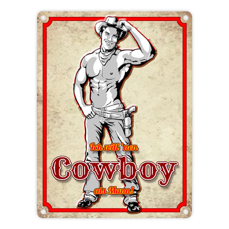 Metallschild mit sexy Cowboy und Spruch - Ich will 'nen Cowboy als Mann