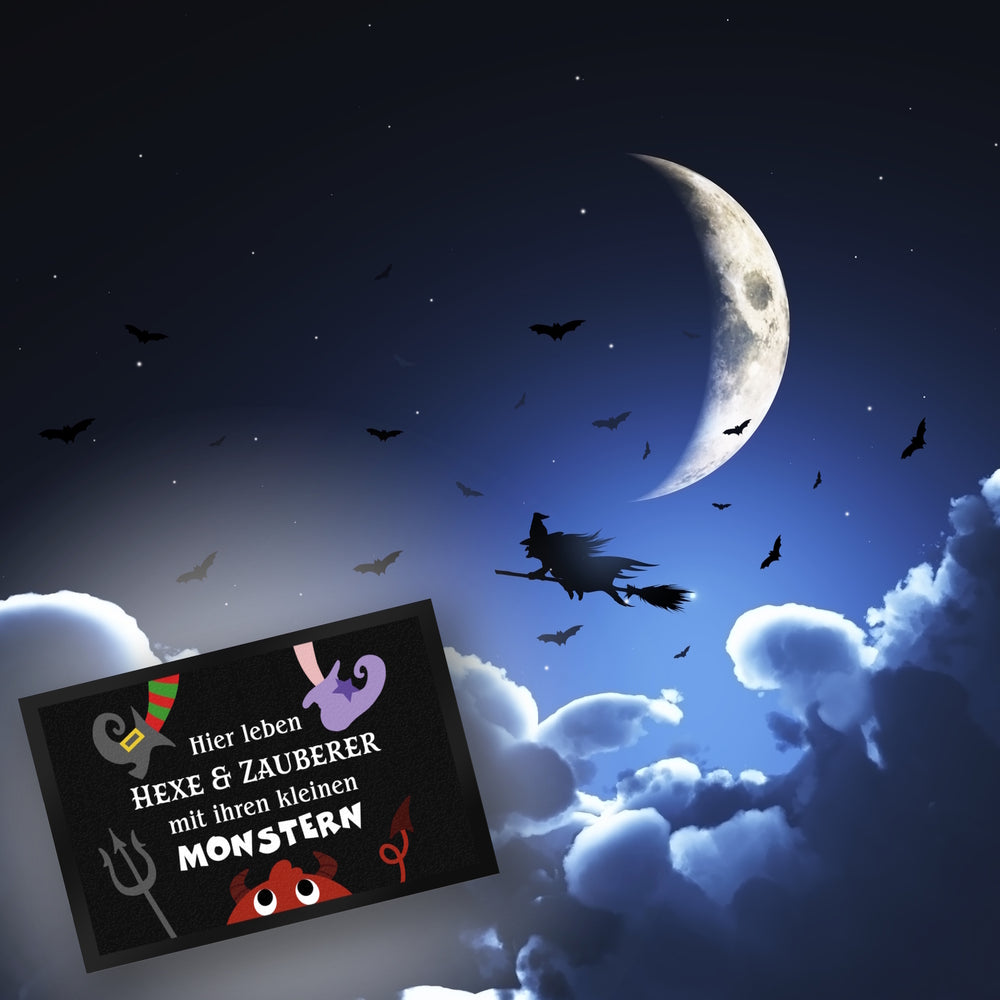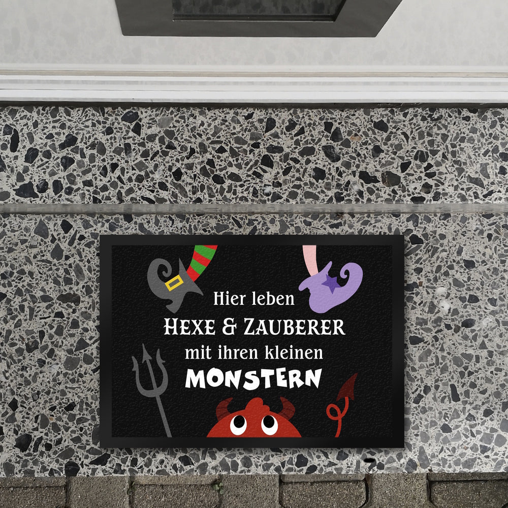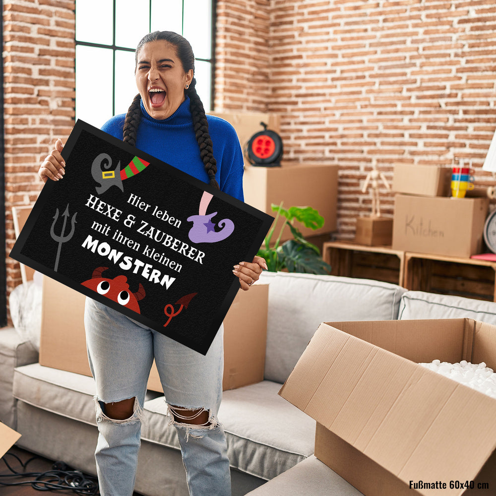 Monster Fußmatte in 35x50 cm mit Spruch Hier leben Hexe & Zauberer