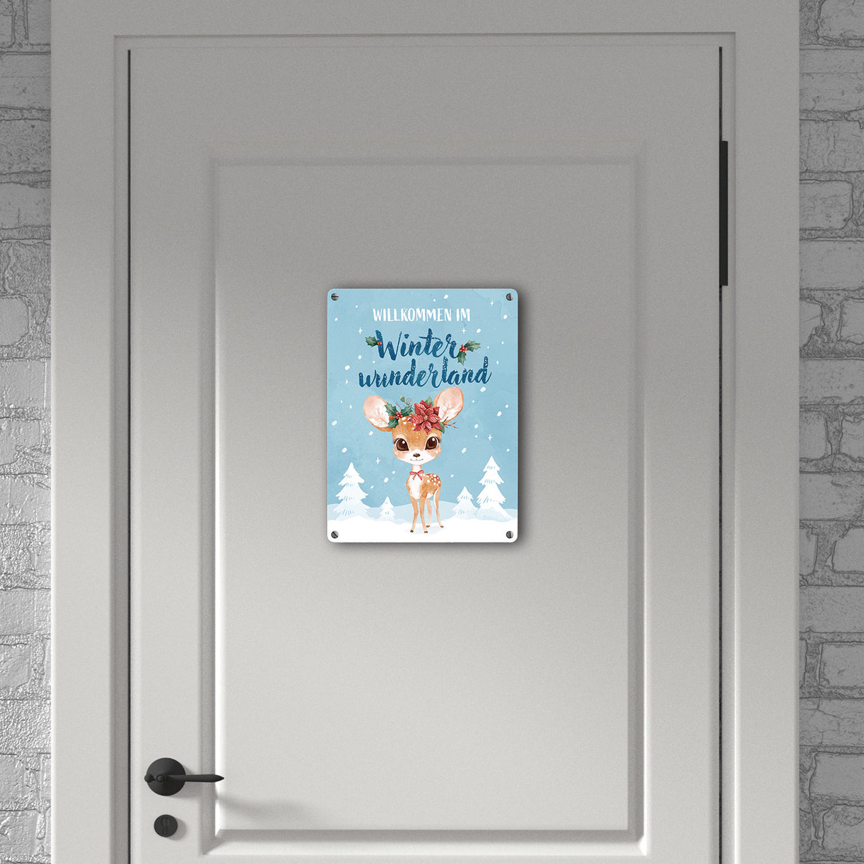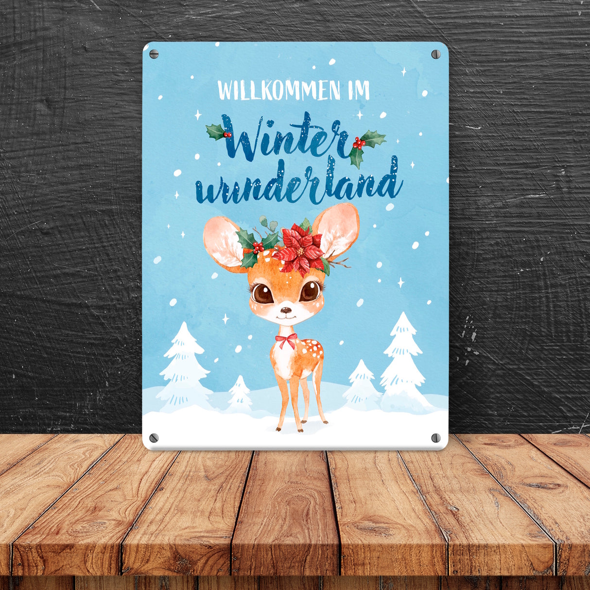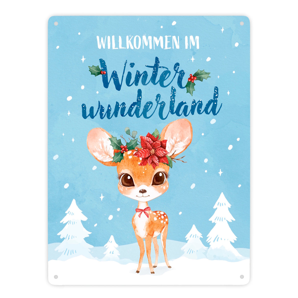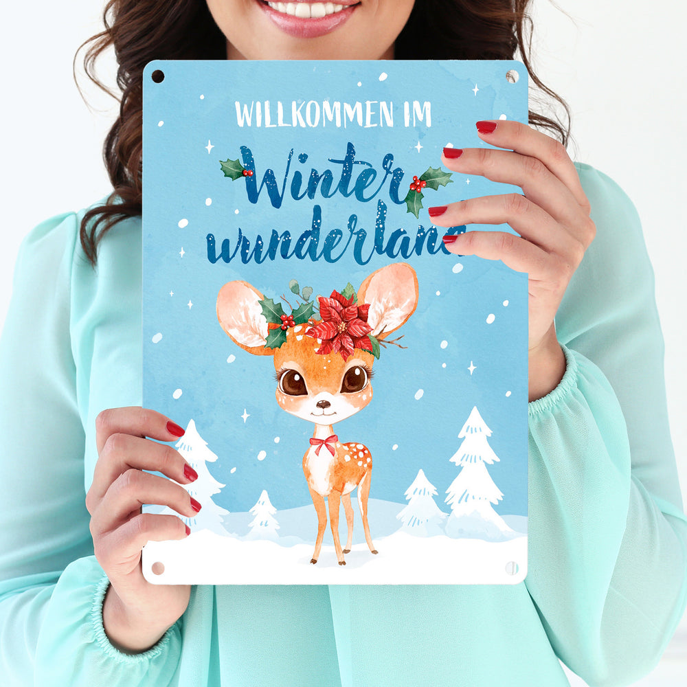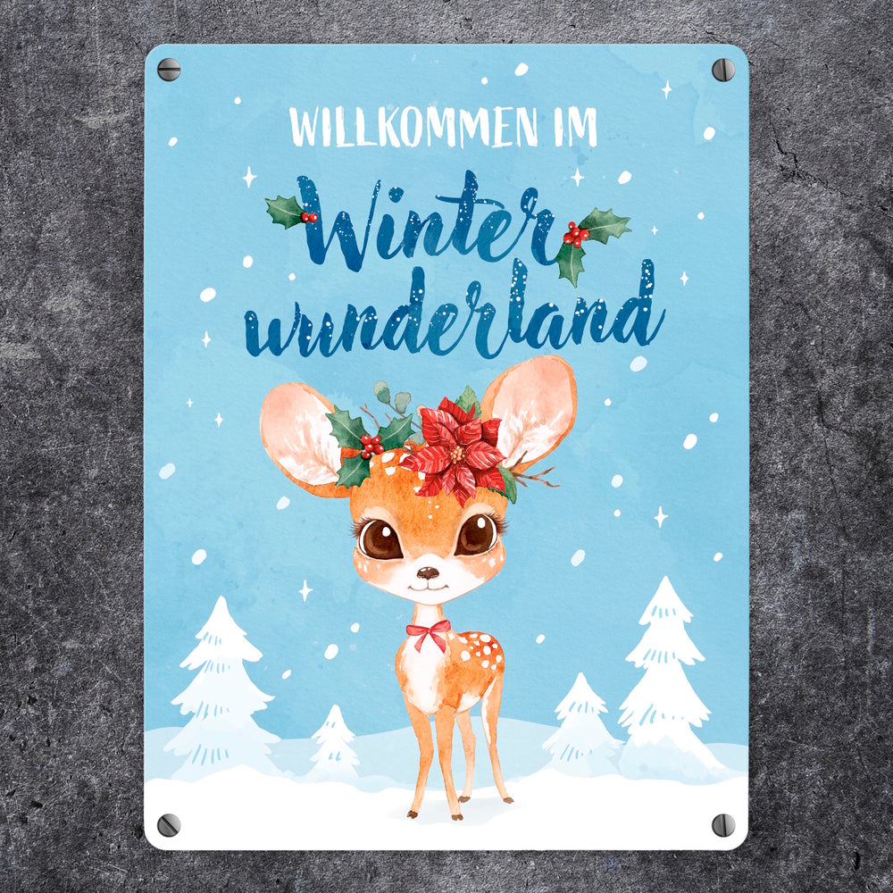- 1x Rehkitz Metallschild in 15x20 cm mit Spruch Willkommen im Winterwunderland in der gewählten Größe