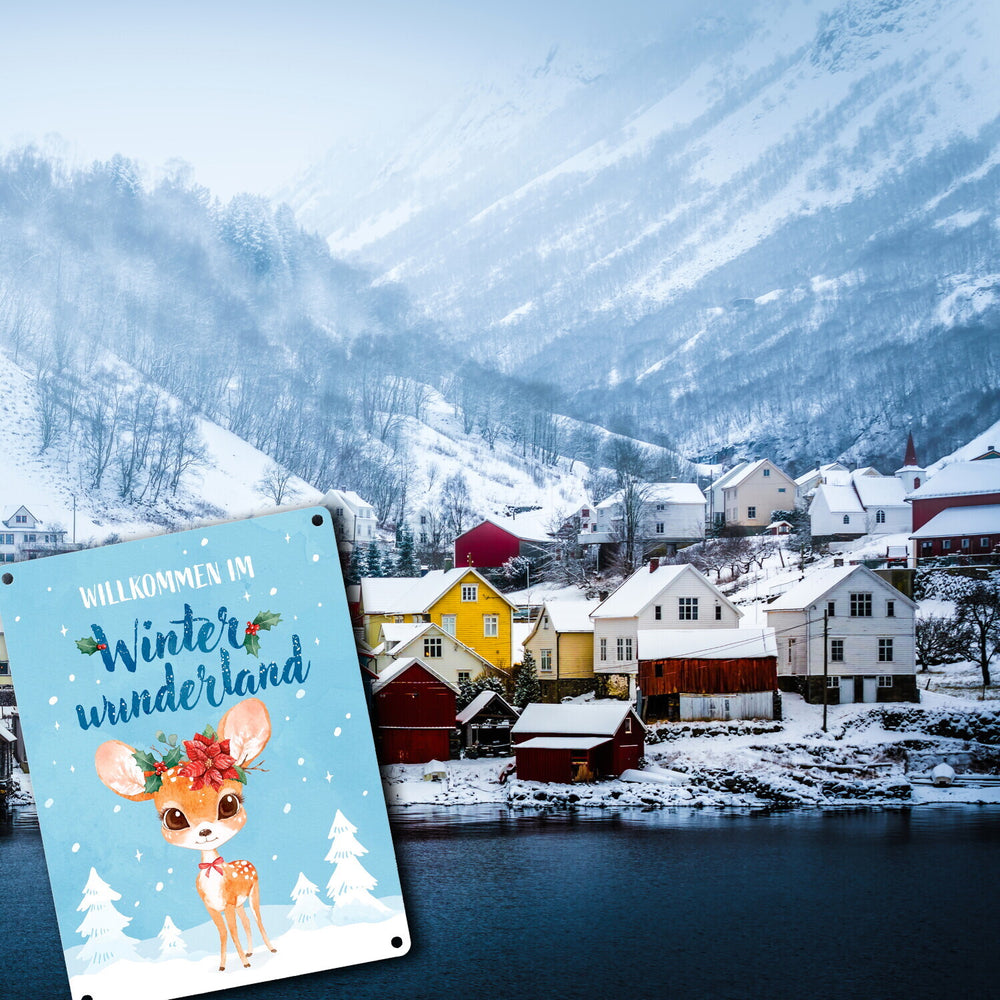 Rehkitz Metallschild in 15x20 cm mit Spruch Willkommen im Winterwunderland - 15x20 cm ist auf Lager und wird versandt, sobald es wieder verfügbar ist