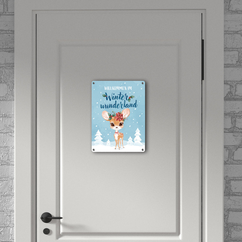 Rehkitz Metallschild in 15x20 cm mit Spruch Willkommen im Winterwunderland