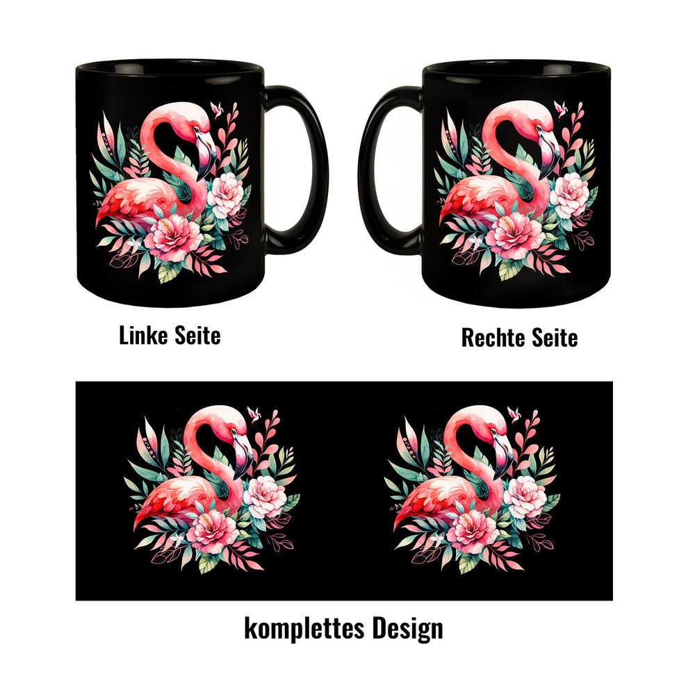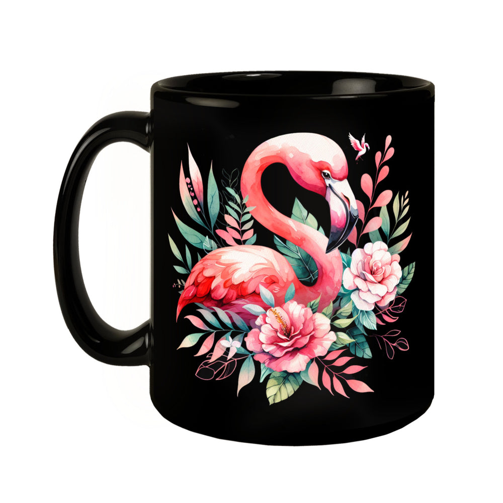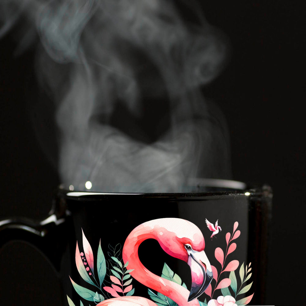 - Wappne dich fürs Kaffeekränzchen im Dschungelstil mit unserer "Rosa Flamingo Tasse in Schwarz". Das ist nicht nur eine Tasse, das ist ein Statement! Ein rosa Prachtexemplar von Flamingo stolziert zwischen tropischen Blumen und Blättern. Und um den Look abzurunden: Karminrote Federn, die sich elegant ums Gefäß schmiegen.