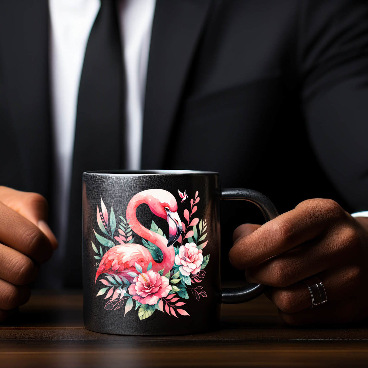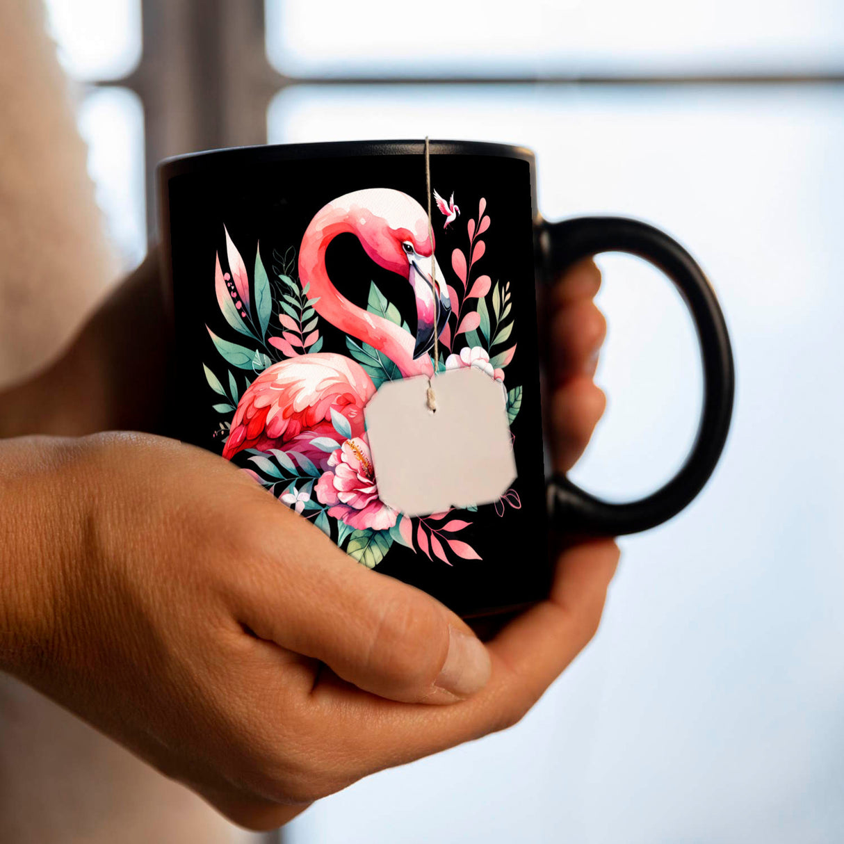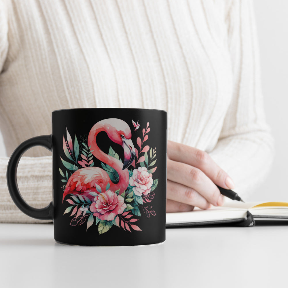 - Wappne dich fürs Kaffeekränzchen im Dschungelstil mit unserer "Rosa Flamingo Tasse in Schwarz". Das ist nicht nur eine Tasse, das ist ein Statement! Ein rosa Prachtexemplar von Flamingo stolziert zwischen tropischen Blumen und Blättern. Und um den Look abzurunden: Karminrote Federn, die sich elegant ums Gefäß schmiegen.