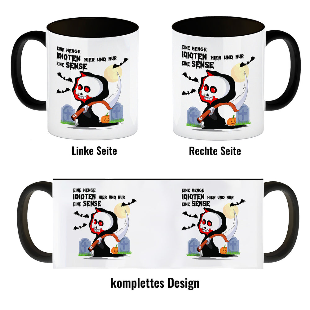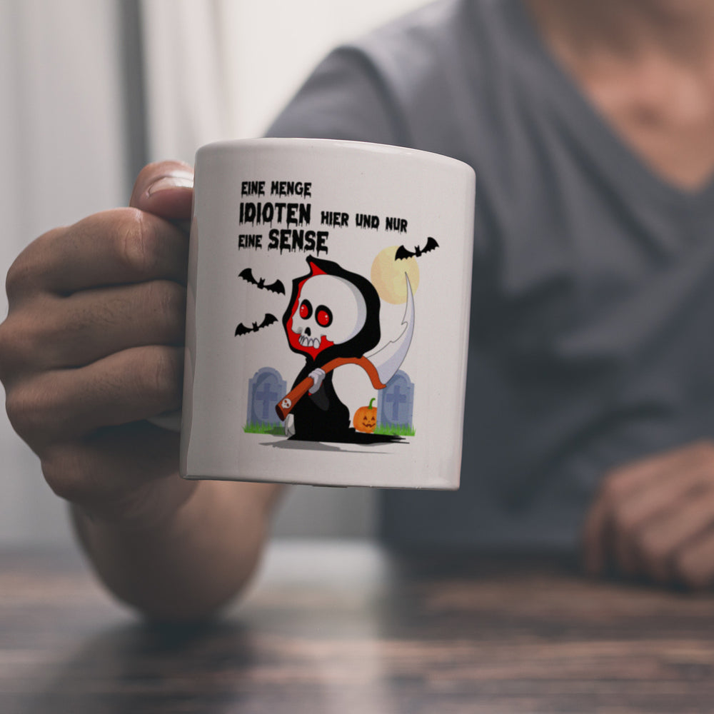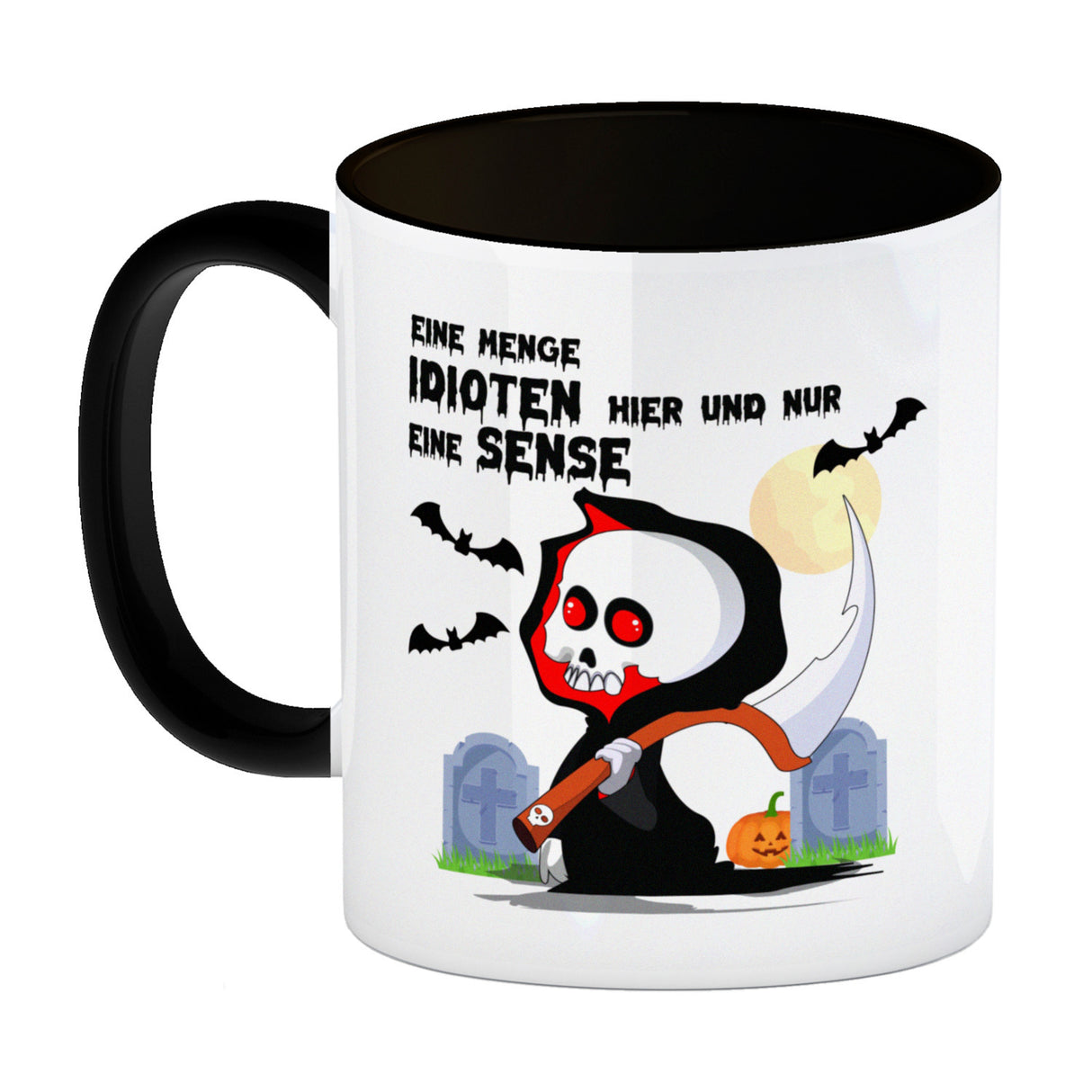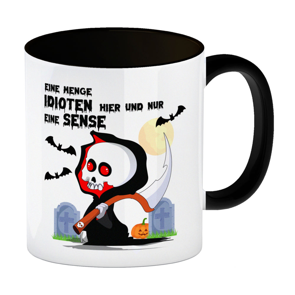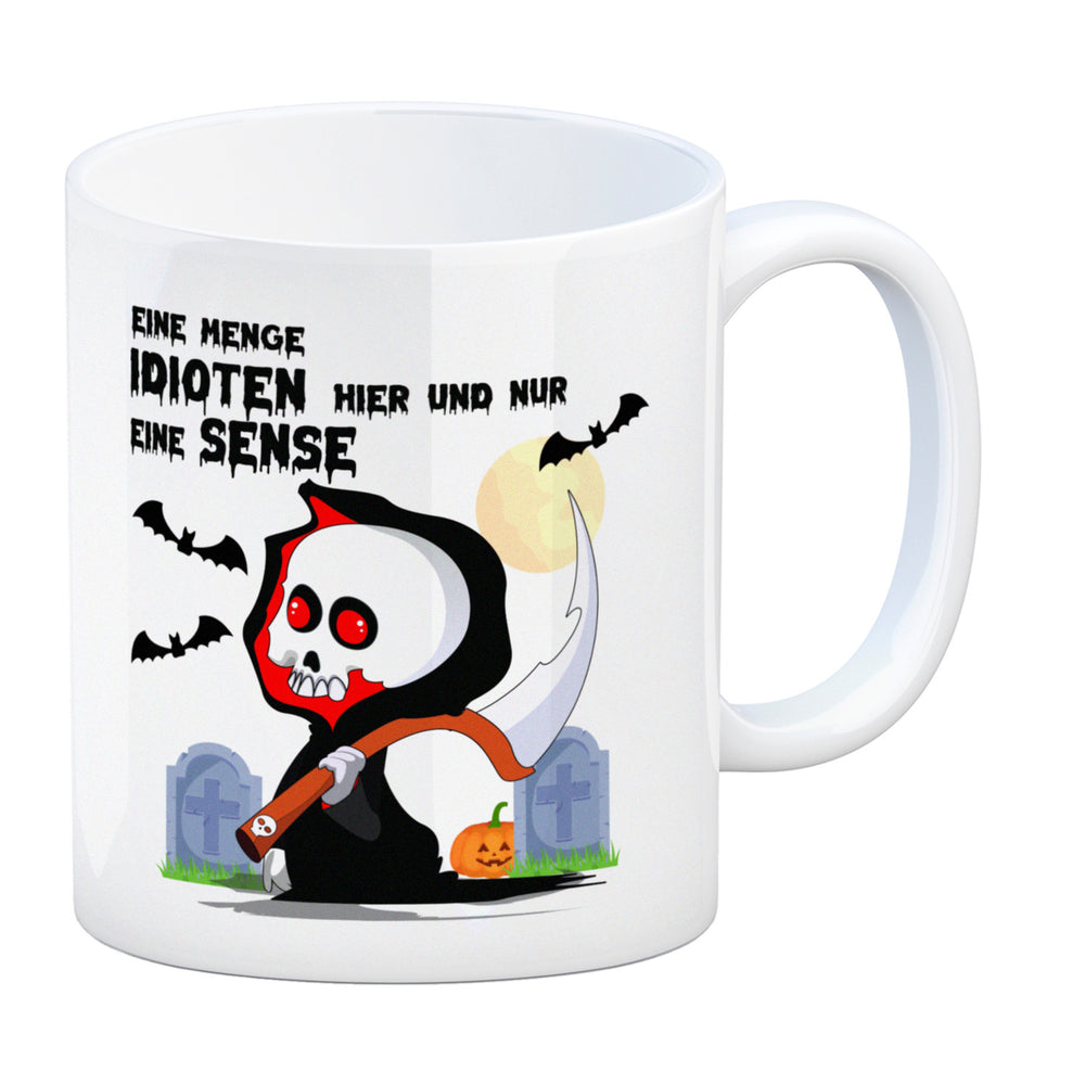 - Zeige deinen Freunden, wie gruselig du sein kannst und überrasche sie mit dem Kaffeebecher in Sensenmann-Optik! Der Kaffeebecher mit dem Spruch "Eine Menge Idioten hier und nur eine Sense" ist eine tolle Geschenkidee zu Halloween. Wenn dein Freund oder deine Familie gerne Tee oder Kaffee trinkt, dann greife auf dieses originelle Design zurück, um etwas Besonderes anzubieten.