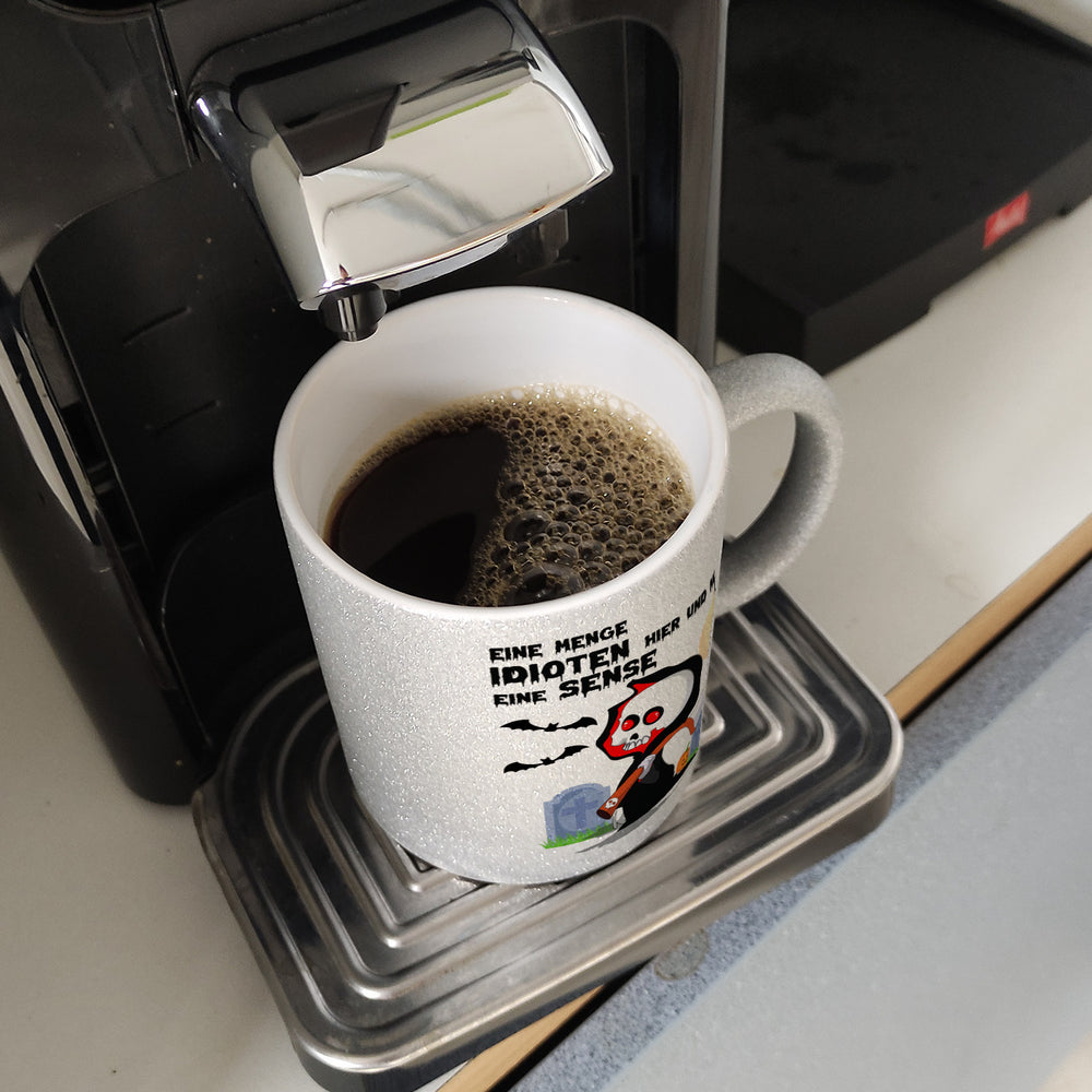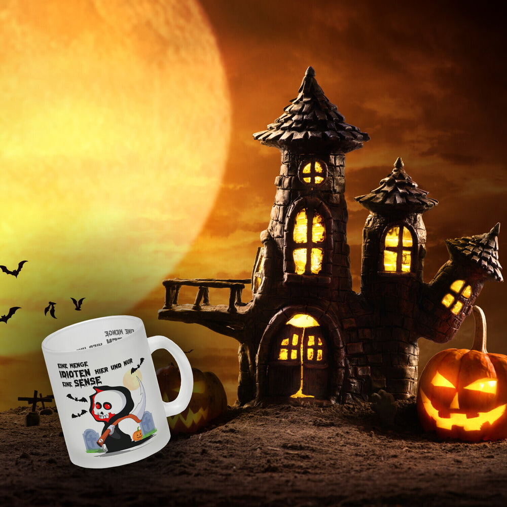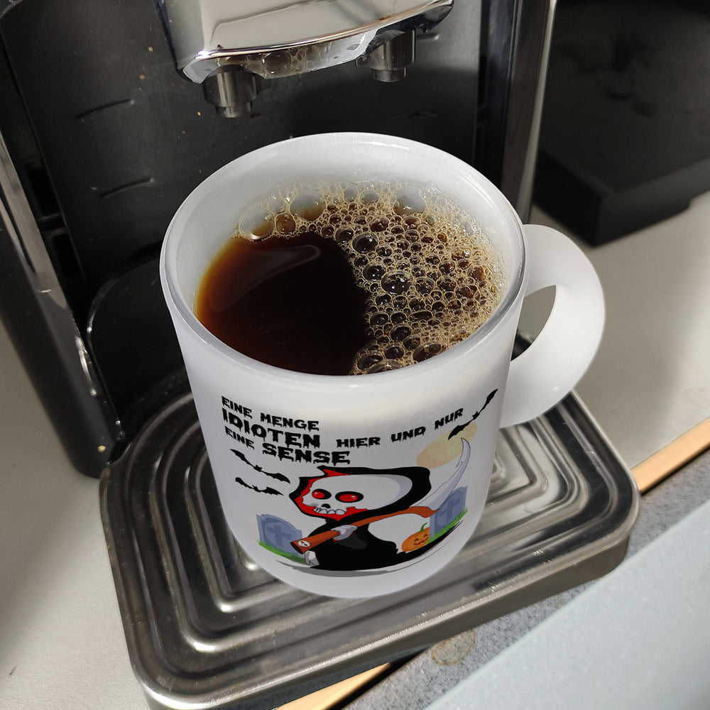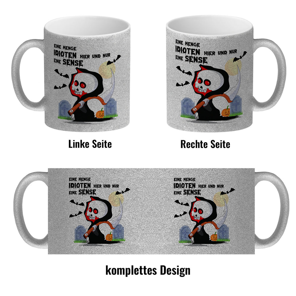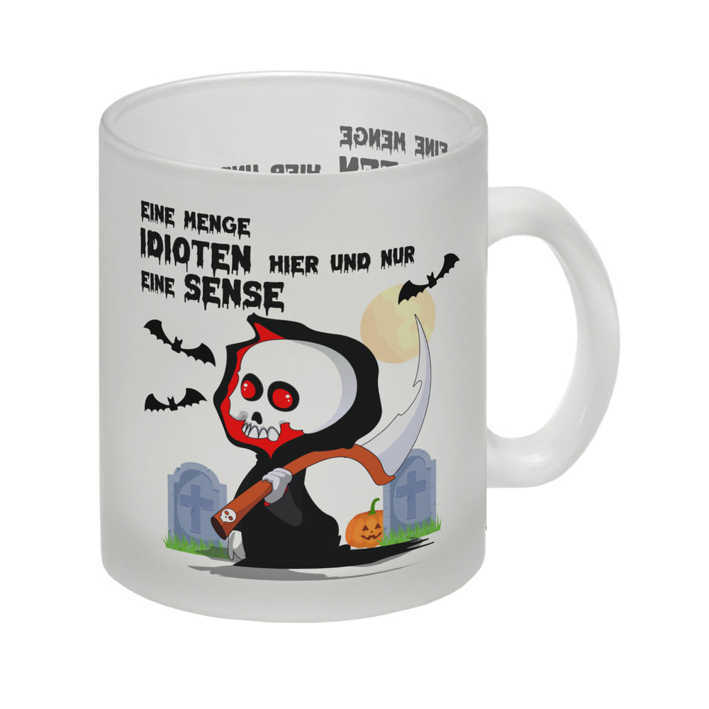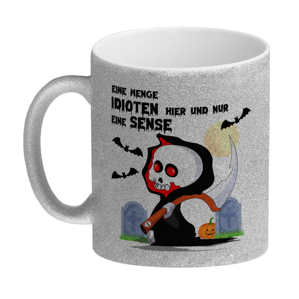 - Zeige deinen Freunden, wie gruselig du sein kannst und überrasche sie mit dem Kaffeebecher in Sensenmann-Optik! Der Kaffeebecher mit dem Spruch "Eine Menge Idioten hier und nur eine Sense" ist eine tolle Geschenkidee zu Halloween. Wenn dein Freund oder deine Familie gerne Tee oder Kaffee trinkt, dann greife auf dieses originelle Design zurück, um etwas Besonderes anzubieten.