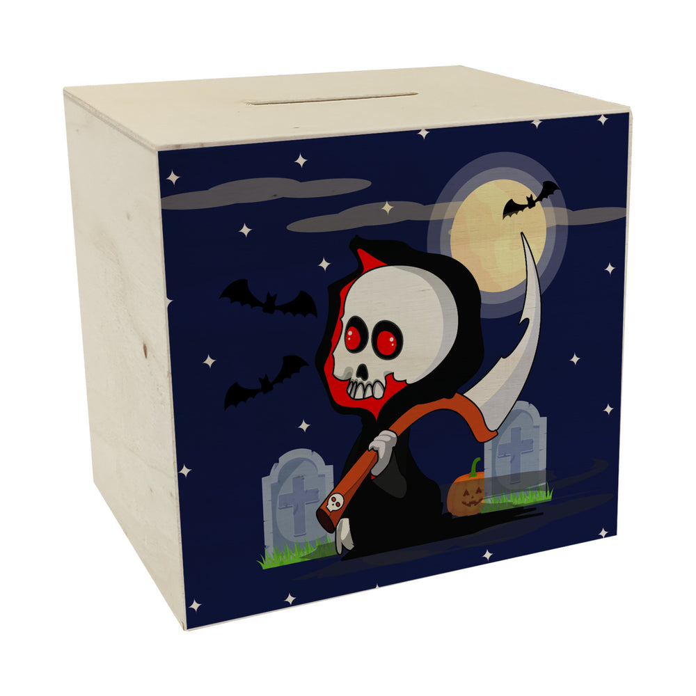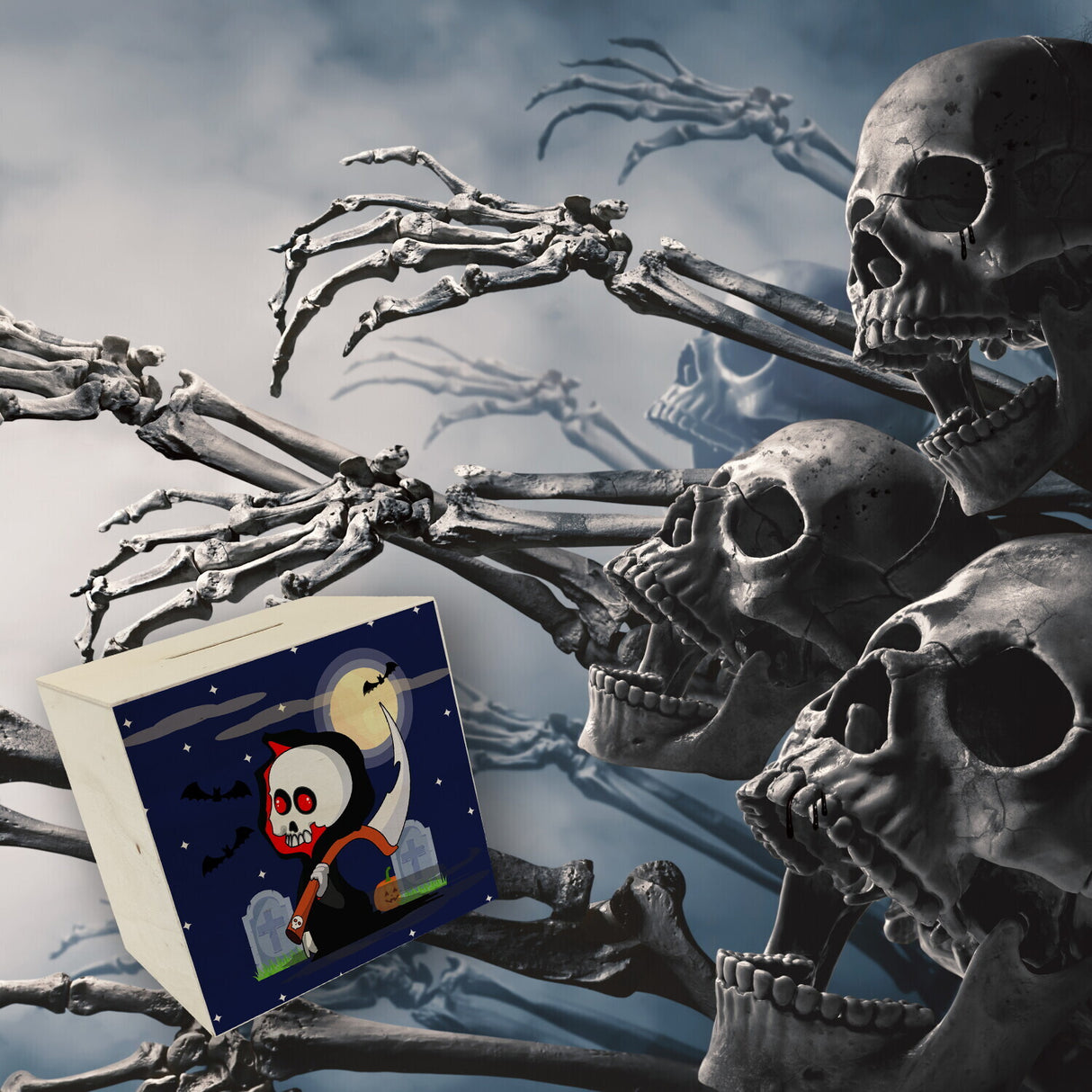 Greifen Sie jetzt zu und holen Sie sich unsere Sensenmann Spardose, eine originelle Geschenkidee zum Weltspartag oder für Ihre Halloweenparty. Diese schaurig charmante Sparbüchse wird mit viel Liebe in Deutschland in Handarbeit hergestellt und ist erhältlich in drei unterschiedlichen Ausführungen: Als schlichte Holzspardose, als hochwertige ovale Keramik-Version oder als exklusive Rahmen-Variante aus Holz mit Sichtfenster. So wird nicht nur die Finanzierung der Party gesichert, sondern auch ein kleines Vermögen angespart. Mit unserer Sensenmann Spardose liegt man garantiert goldrichtig!