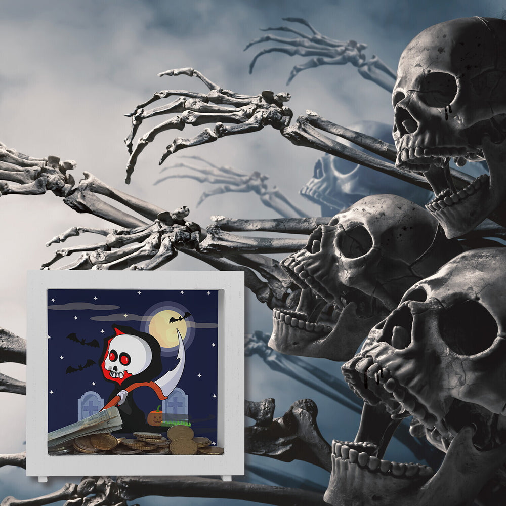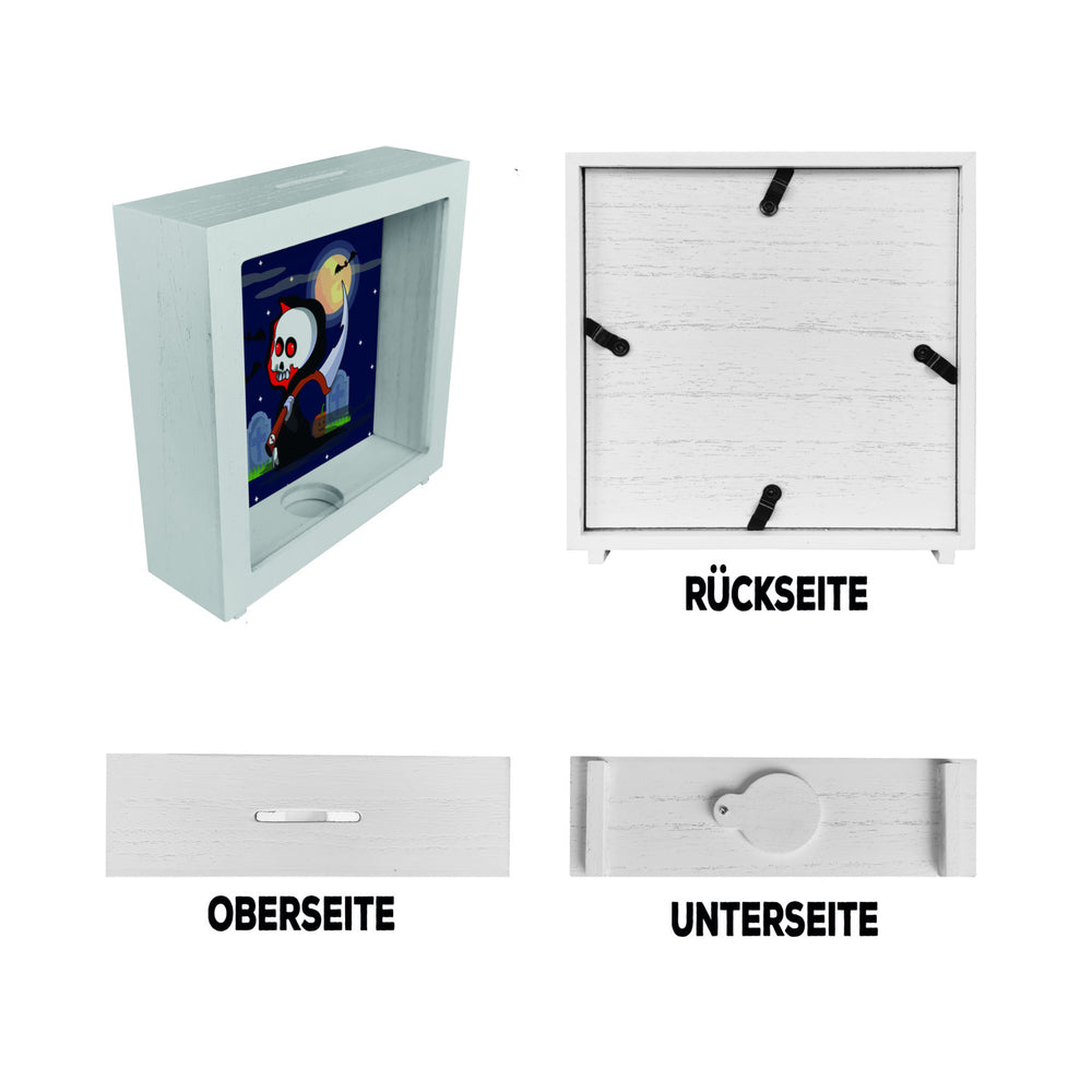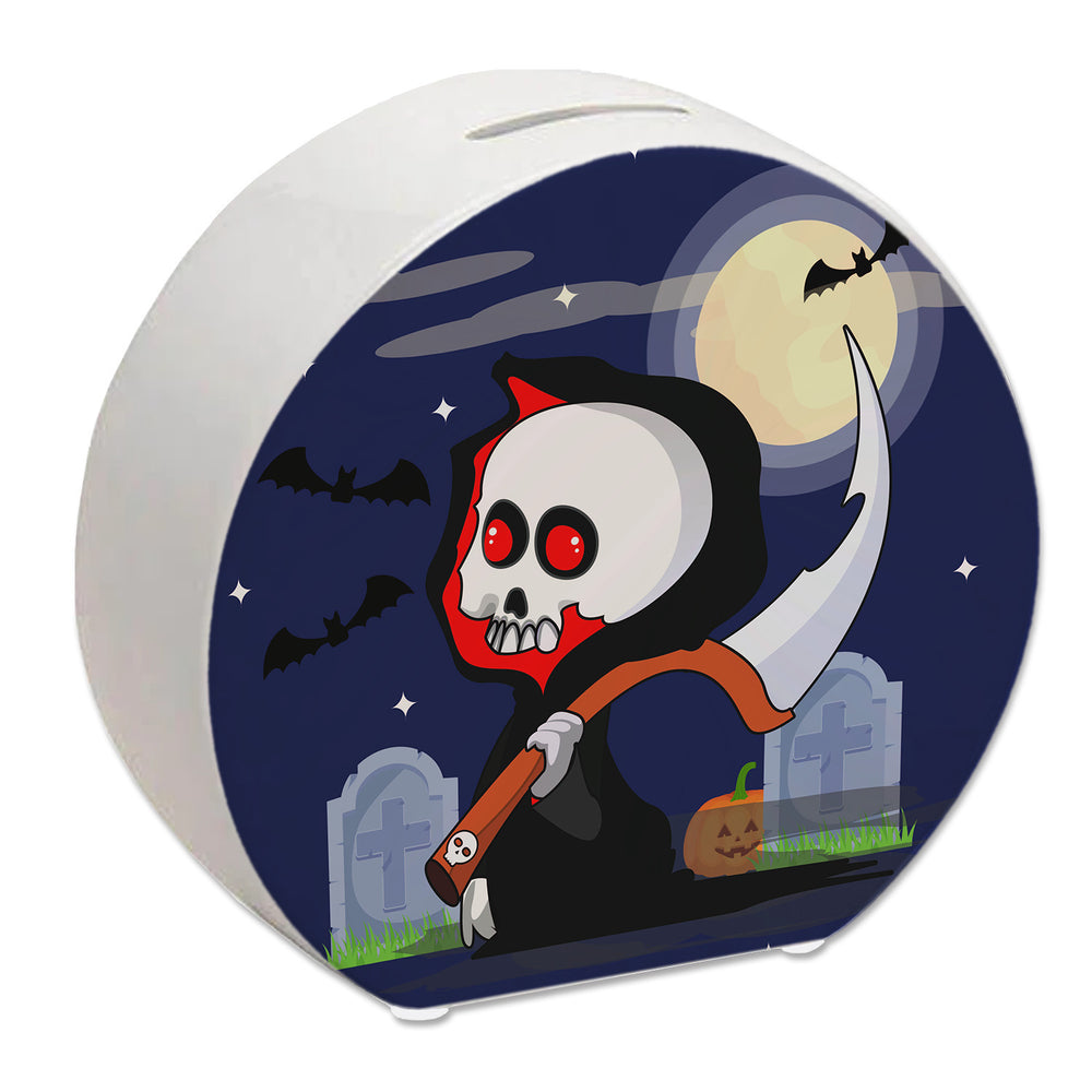 • Die Spardose mit Sensenmann-Motiv ist eine gruselige und zugleich unterhaltsame Geschenkidee für Freunde zu Halloween oder auch jemand anderem, der gerade beginnt anzusparen. Die Sparbüchse präsentiert den schaurig charmanten Reaper, oder auch "Der Tod persönlich" bei Nacht auf einem Friedhof und lädt dazu ein kontinuierlich Kleingeld hineinzuwerfen.