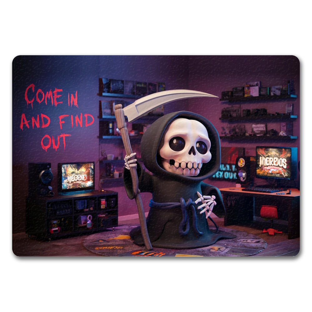 - Betreten Sie das außergewöhnliche Reich der Zocker mit der Skelett des Sensenmanns Fußmatte! Diese humorvolle und gruselige Zimmerdeko verwandelt jeden Eingangsbereich in ein Nerd-Paradies. Mit einem liebenswerten Skelett des Sensenmanns und dem Text "Come in and find out" ist diese Fußmatte ein echter Hingucker.
