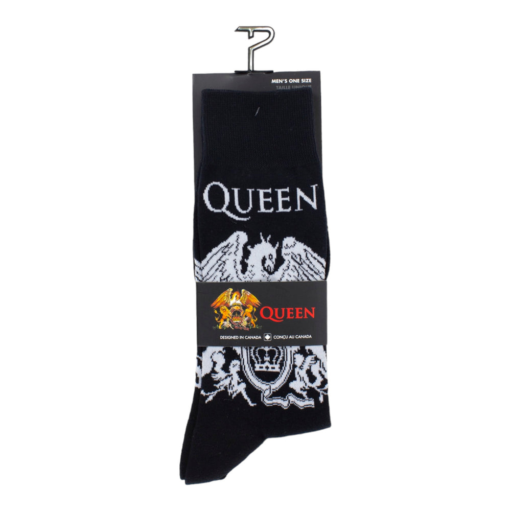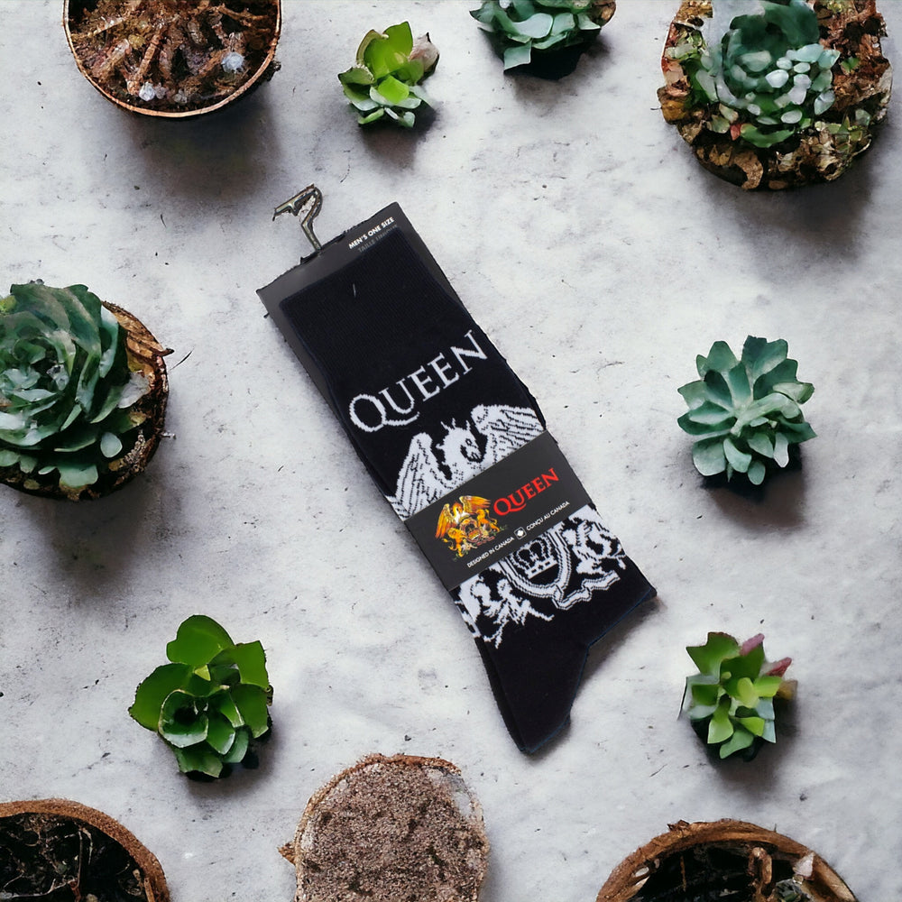 • Diese schwarzen Socken rocken mit Stil! Das ikonische Queen-Logo prangt in rebellischem Weiß seitlich, während der Schriftzug über deinen Knöcheln dich zum unaufhaltsamen Stagediver macht. Ein Tribut an Rockmusik – an deinen Füßen!