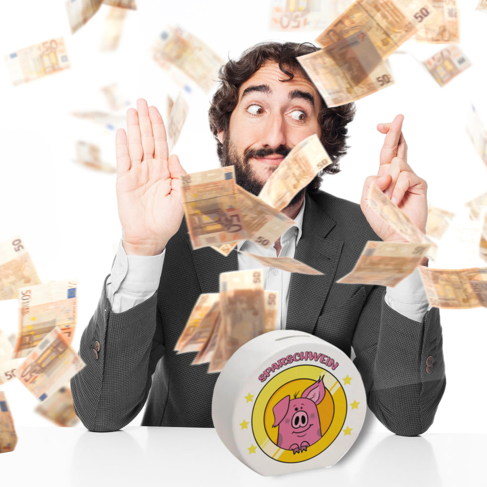 - 1x Spardose mit lustigem Schweinchen Motiv und Spruch - Sparschwein in der gewählten Ausführung