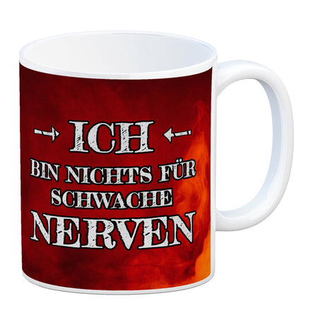 Ich bin nichts für schwache Nerven Kaffeebecher mit Flammenhintergrund