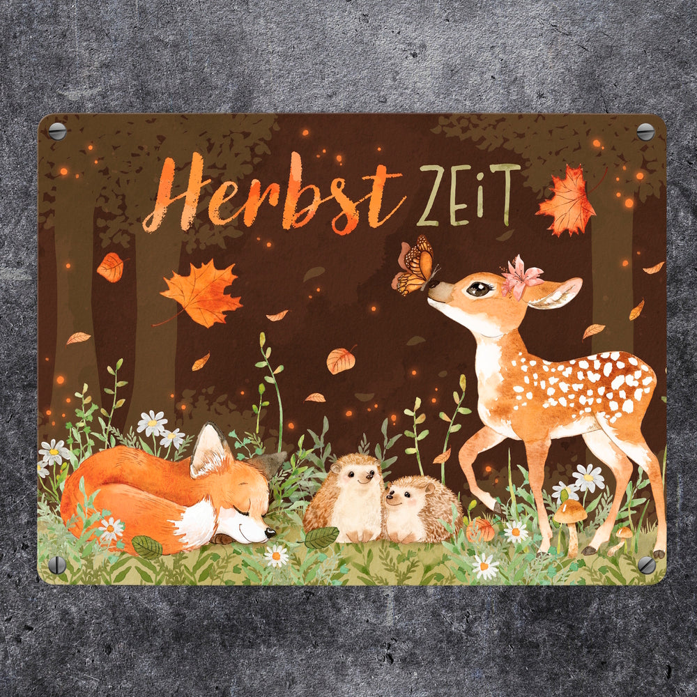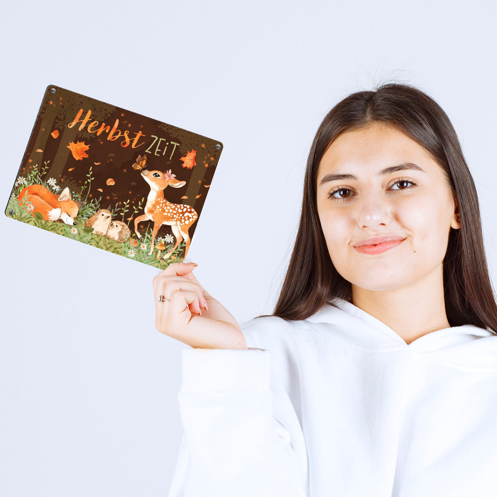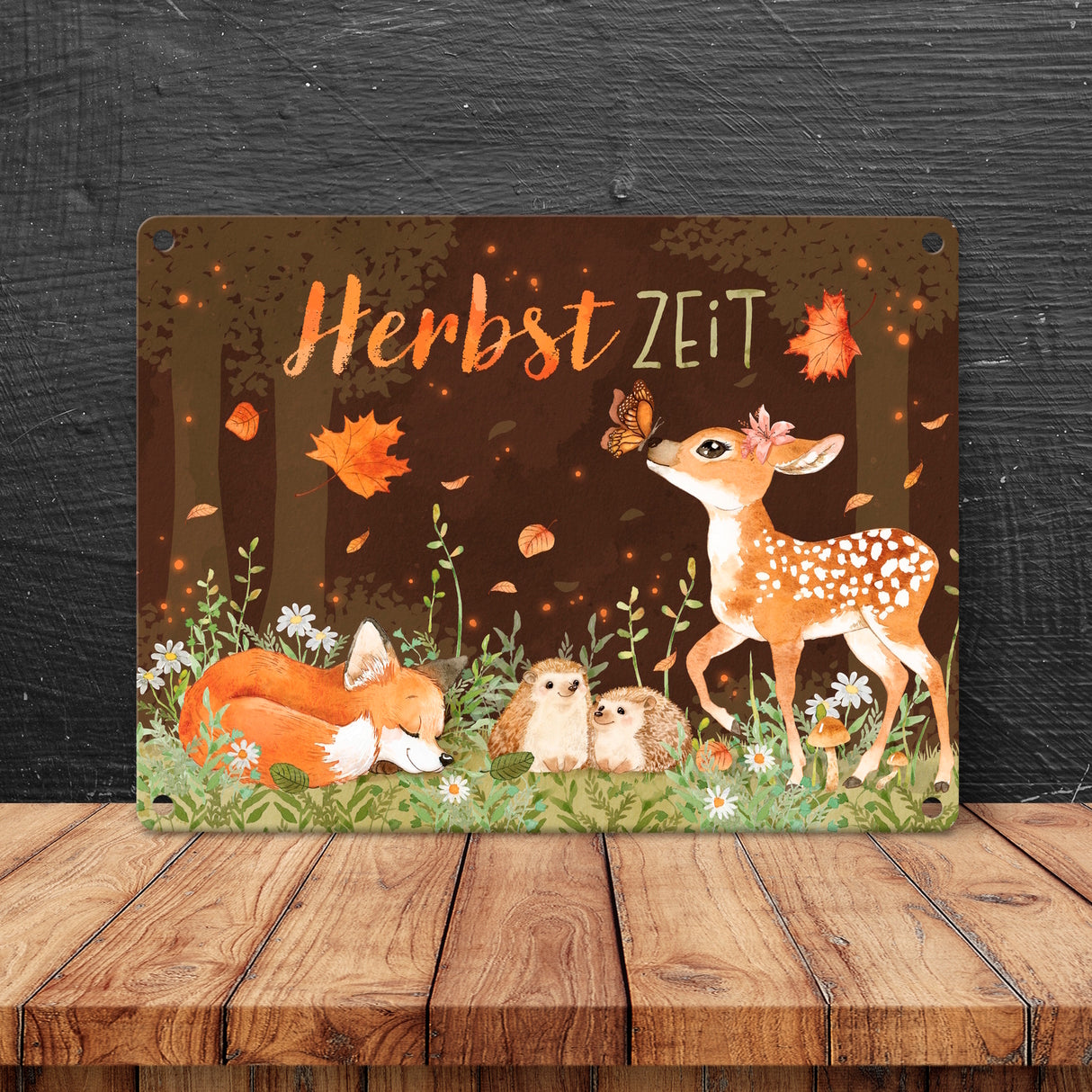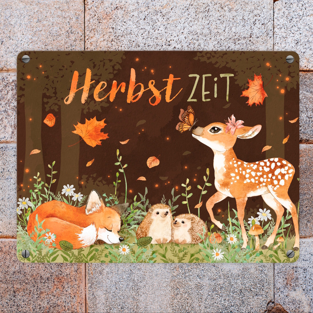 - 1x Tiere des Waldes Metallschild in 15x20 cm mit Spruch Herbstzeit in der gewählten Größe