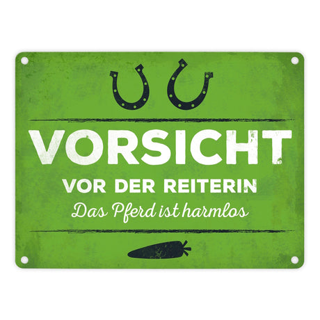 Metallschild mit Spruch: Vorsicht vor der Reiterin...