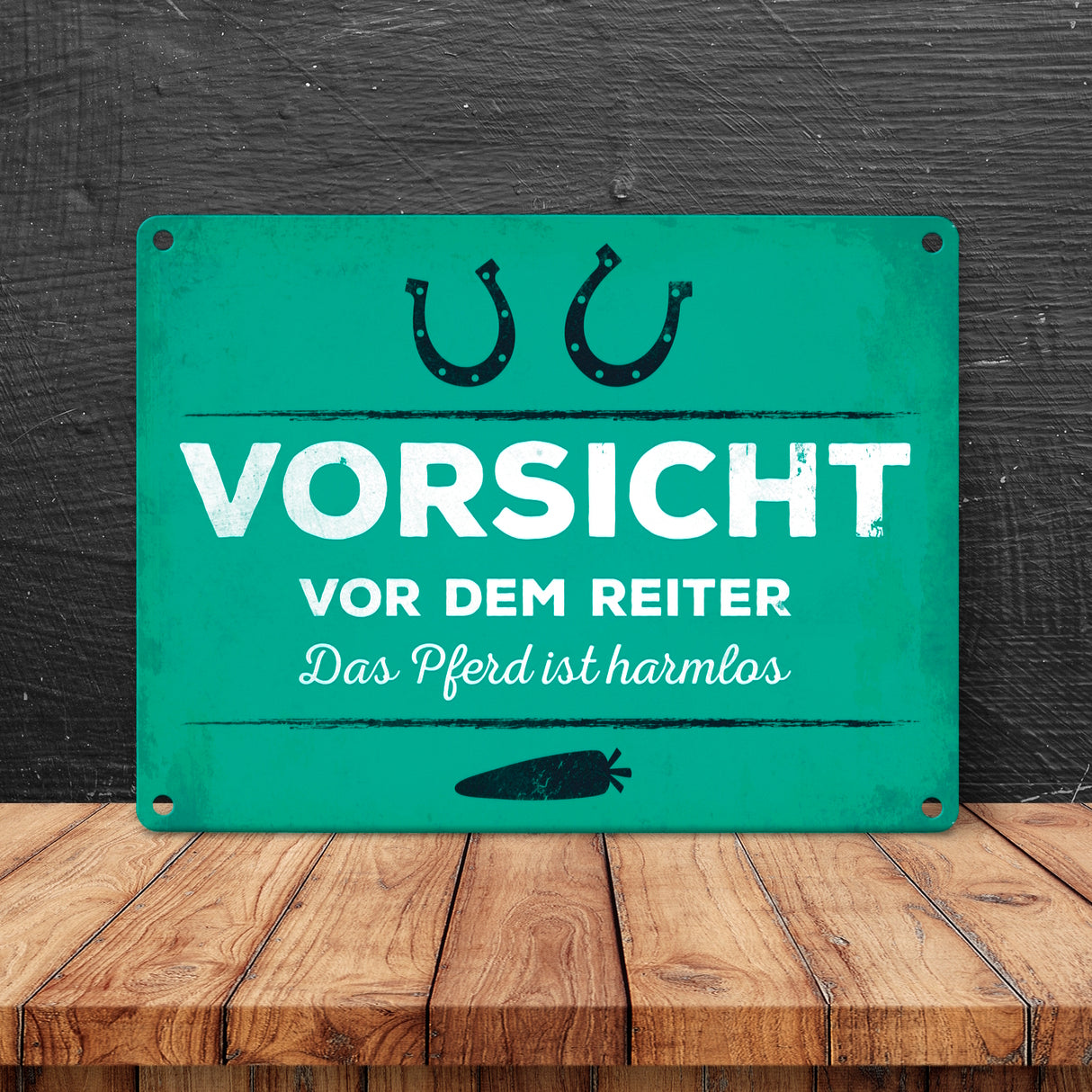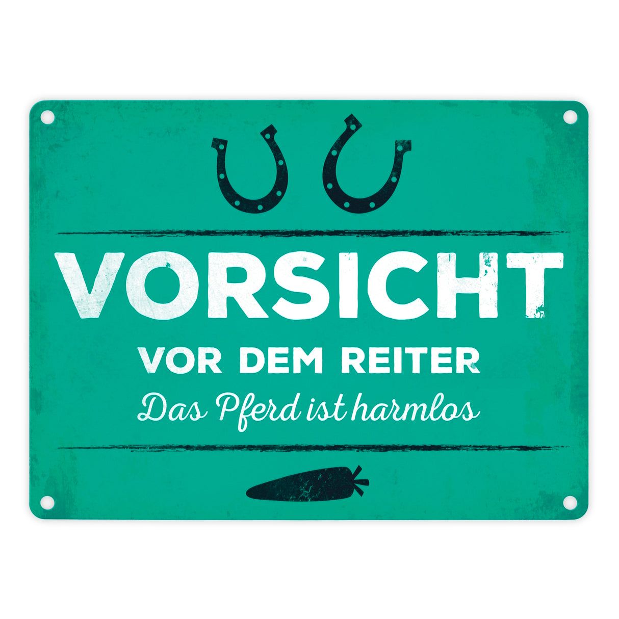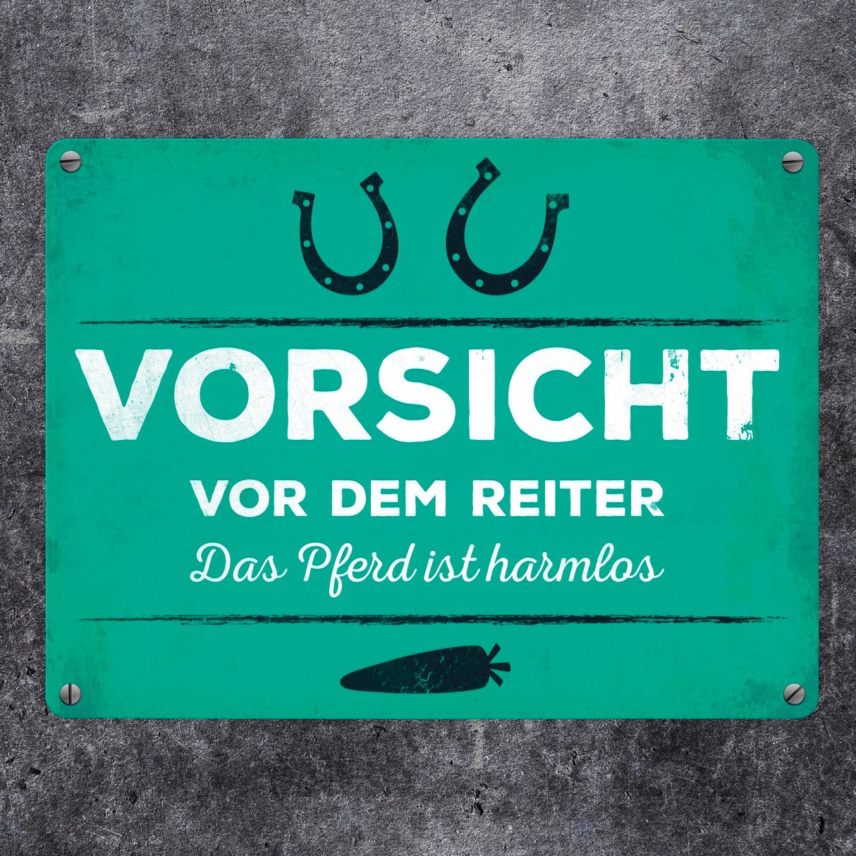 Metallschild mit Spruch: Vorsicht vor der Reiterin, das ...