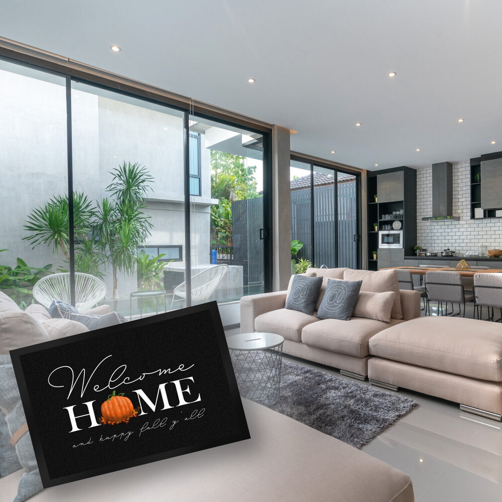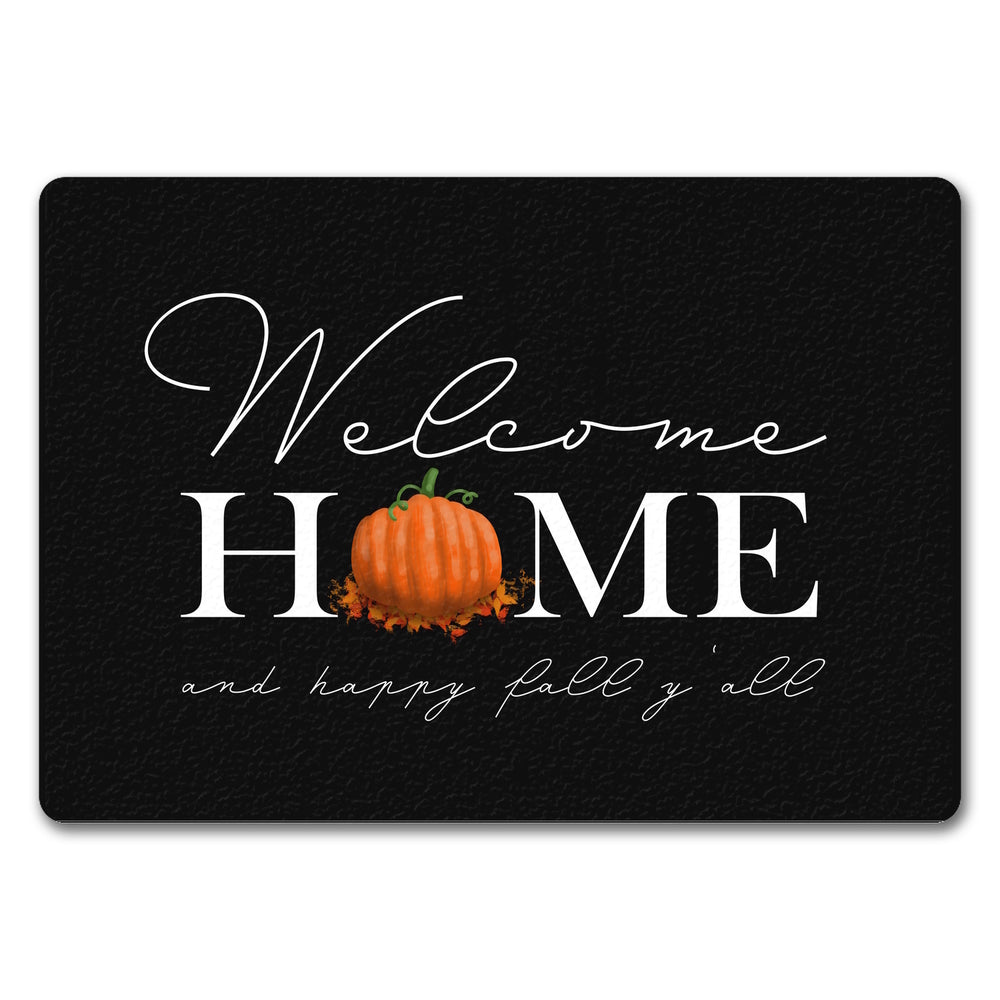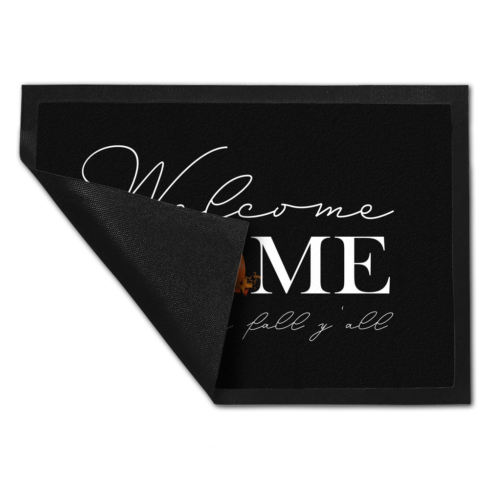 - Unsere Fußmatte mit dem schönen Home-Motiv ist ein wunderbares Geschenk für Frauen zur Einweihungsparty. Auf der Türmatte befindet sich der herzliche Spruch: Welcome home and happy fall y'all, und verleiht jedem Zuhause das richtigen Herbstfeeling.