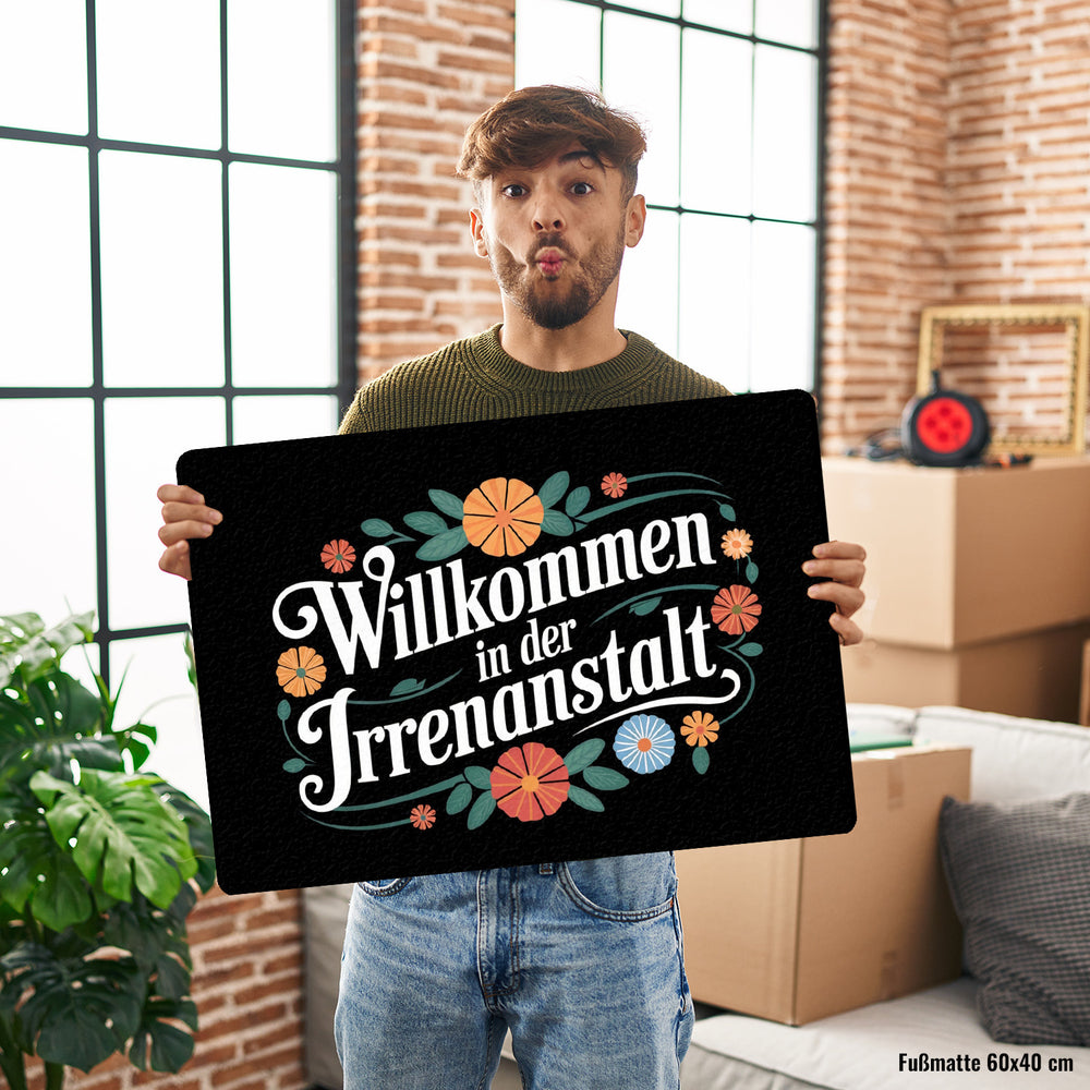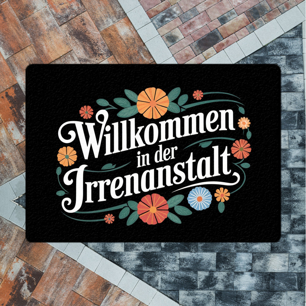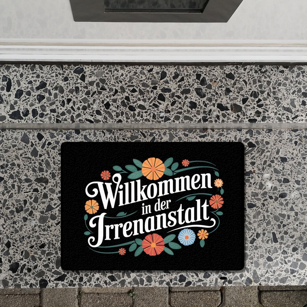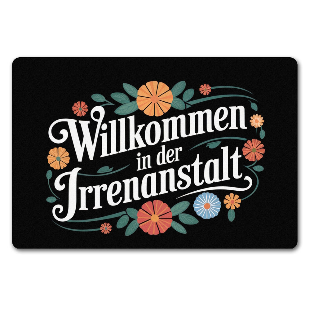- Diese Fußmatte sagt mehr als tausend Worte: "Willkommen in der Irrenanstalt"! Mit ihrem schwarzen Hintergrund und den bunten Blumenornamenten im Vintage-Stil zieht sie alle Blicke auf sich. Perfekt, um deinen Gästen ein schmunzelndes Willkommen zu zaubern und gleich klarzustellen, dass bei dir der Spaß vor der Tür beginnt!