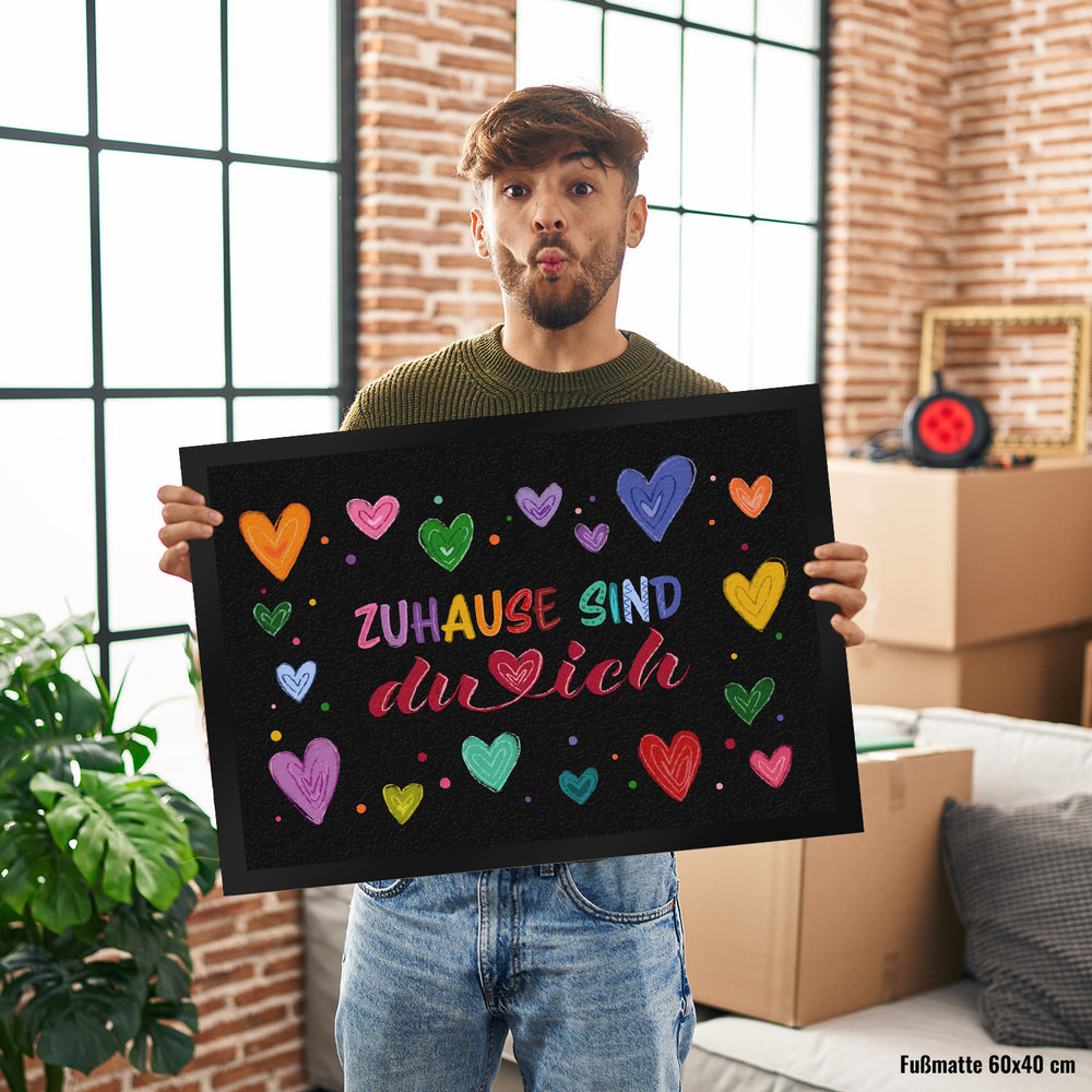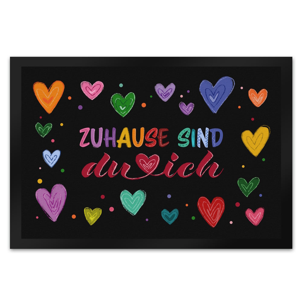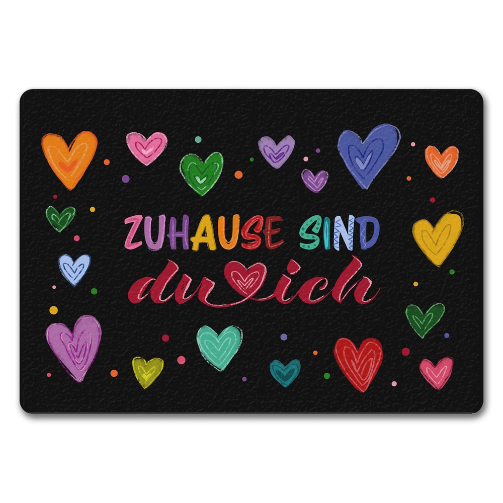 Zuhause sind du und ich Fußmatte mit bunten Herzen