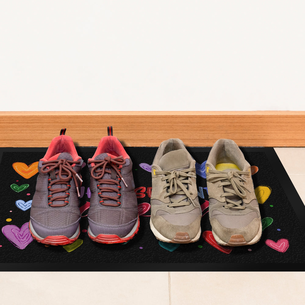 - 1x Zuhause sind du und ich Fußmatte mit bunten Herzen in der gewählten Größe