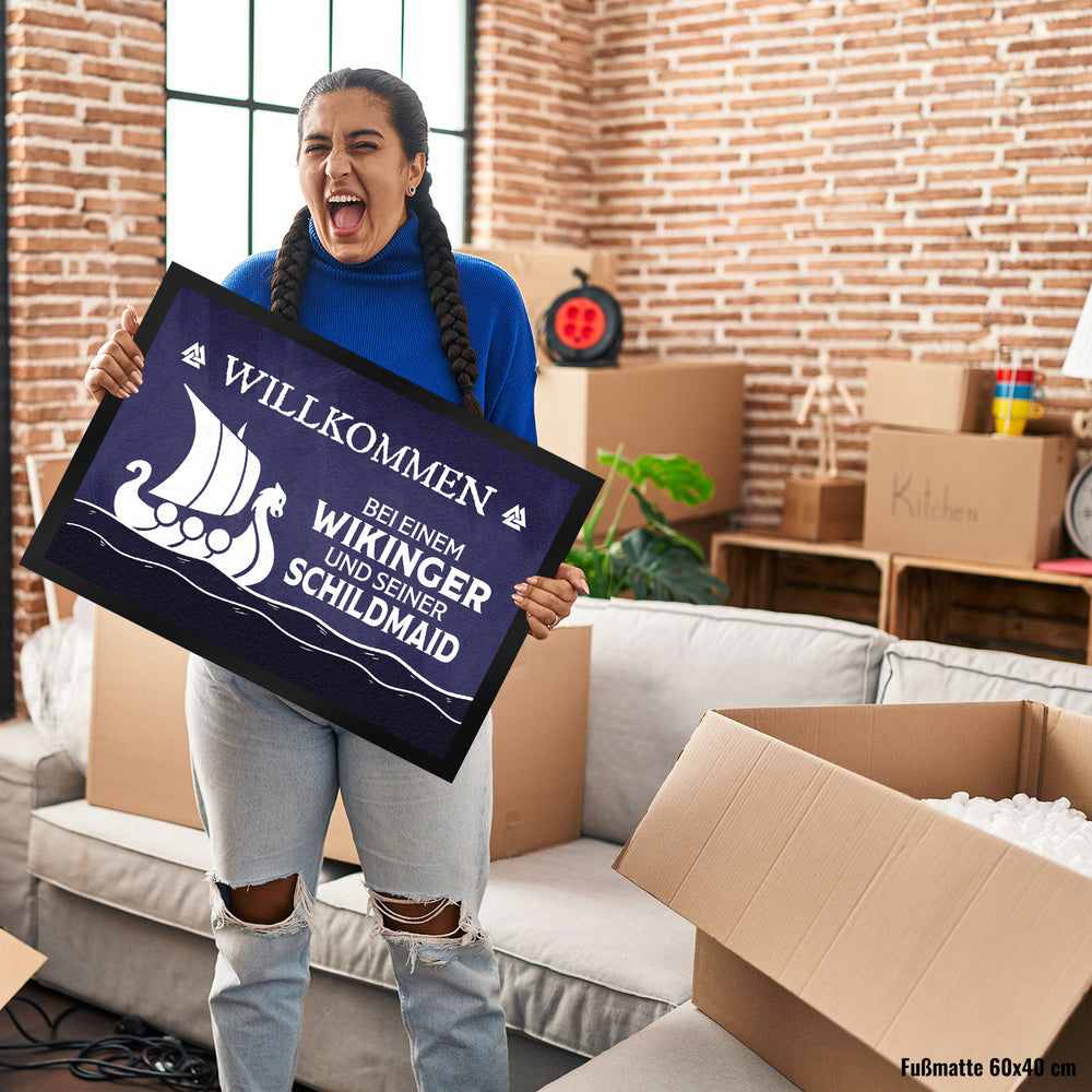 Willkommen bei einem Wikinger und seiner Schildmaid Fußmatte mit Segelboot Motiv