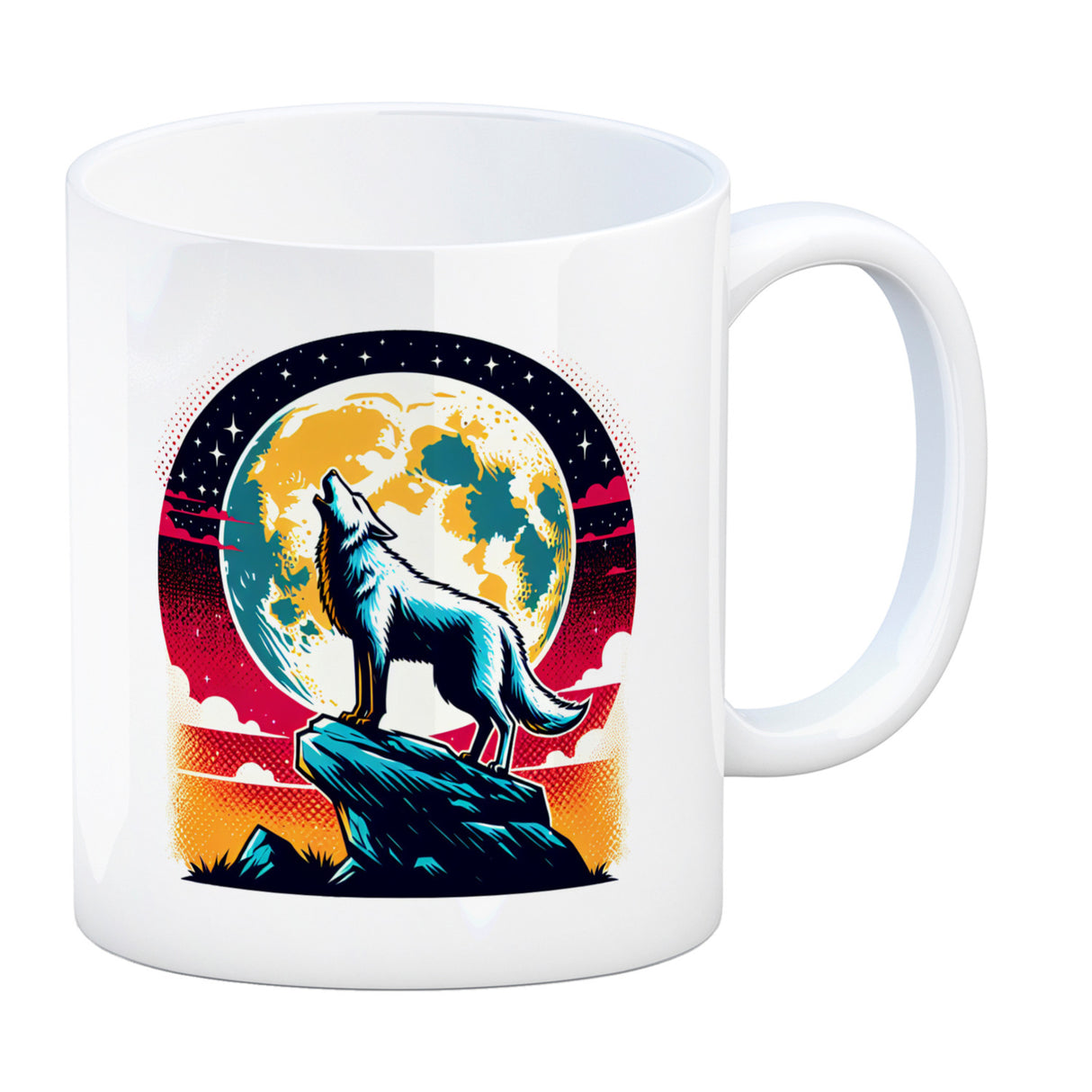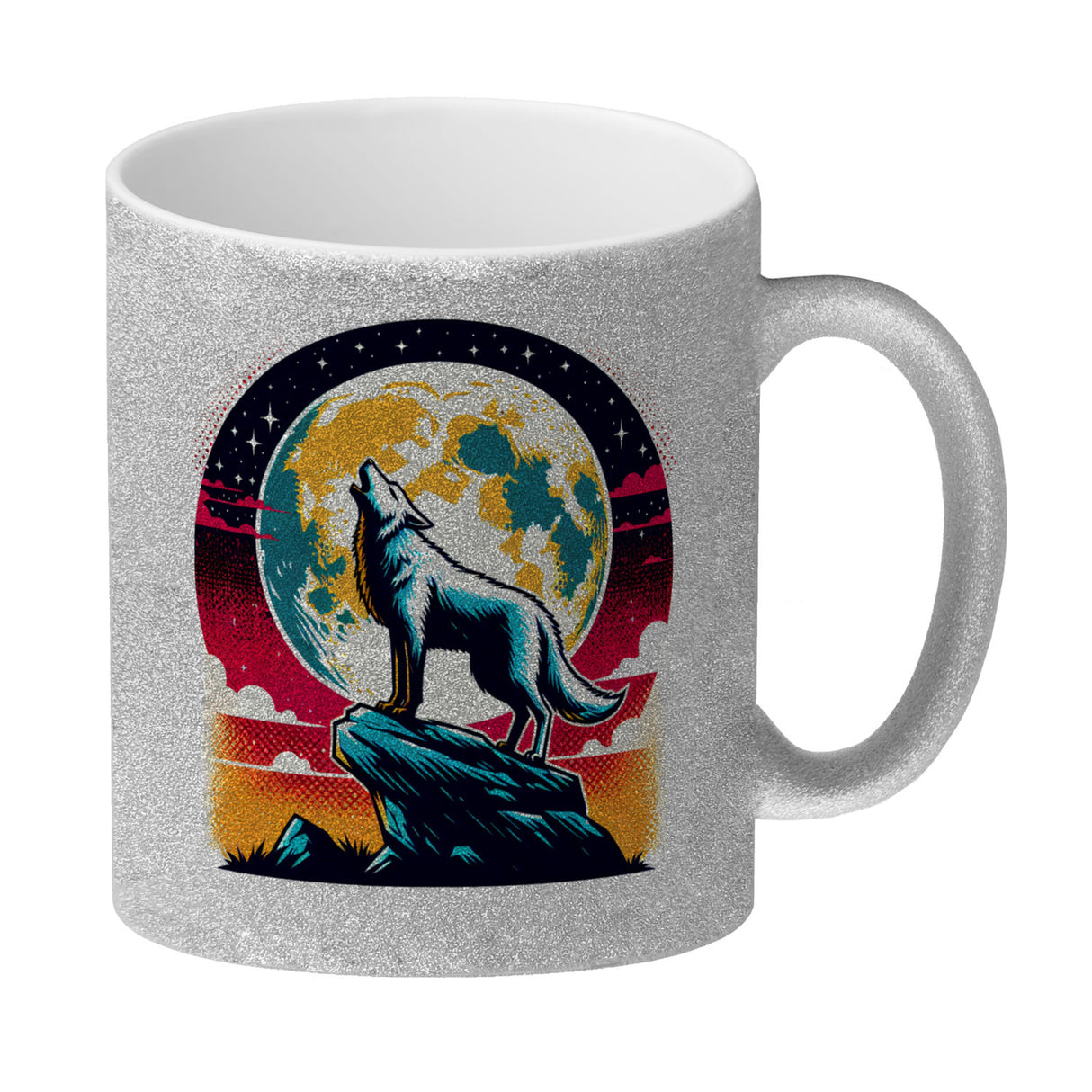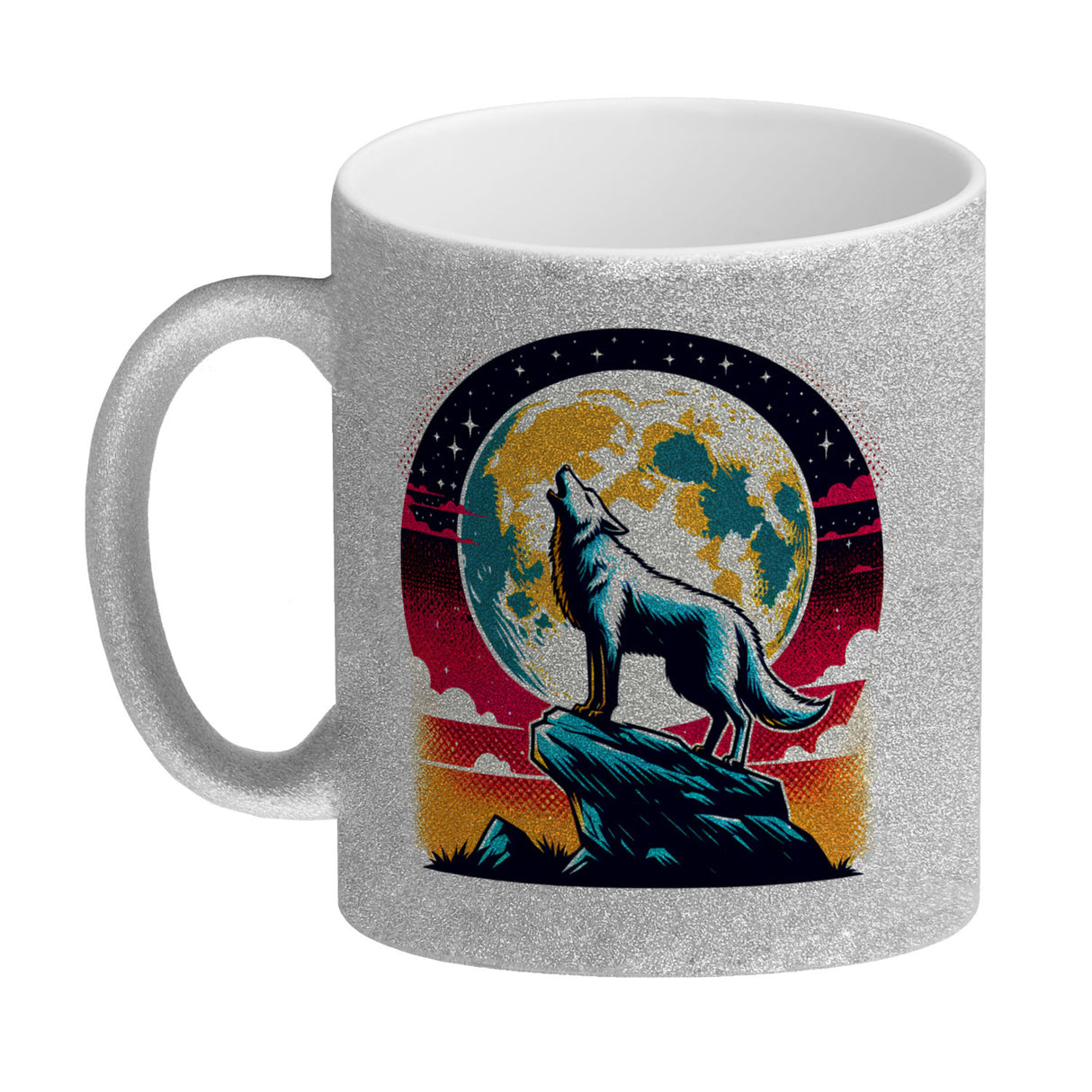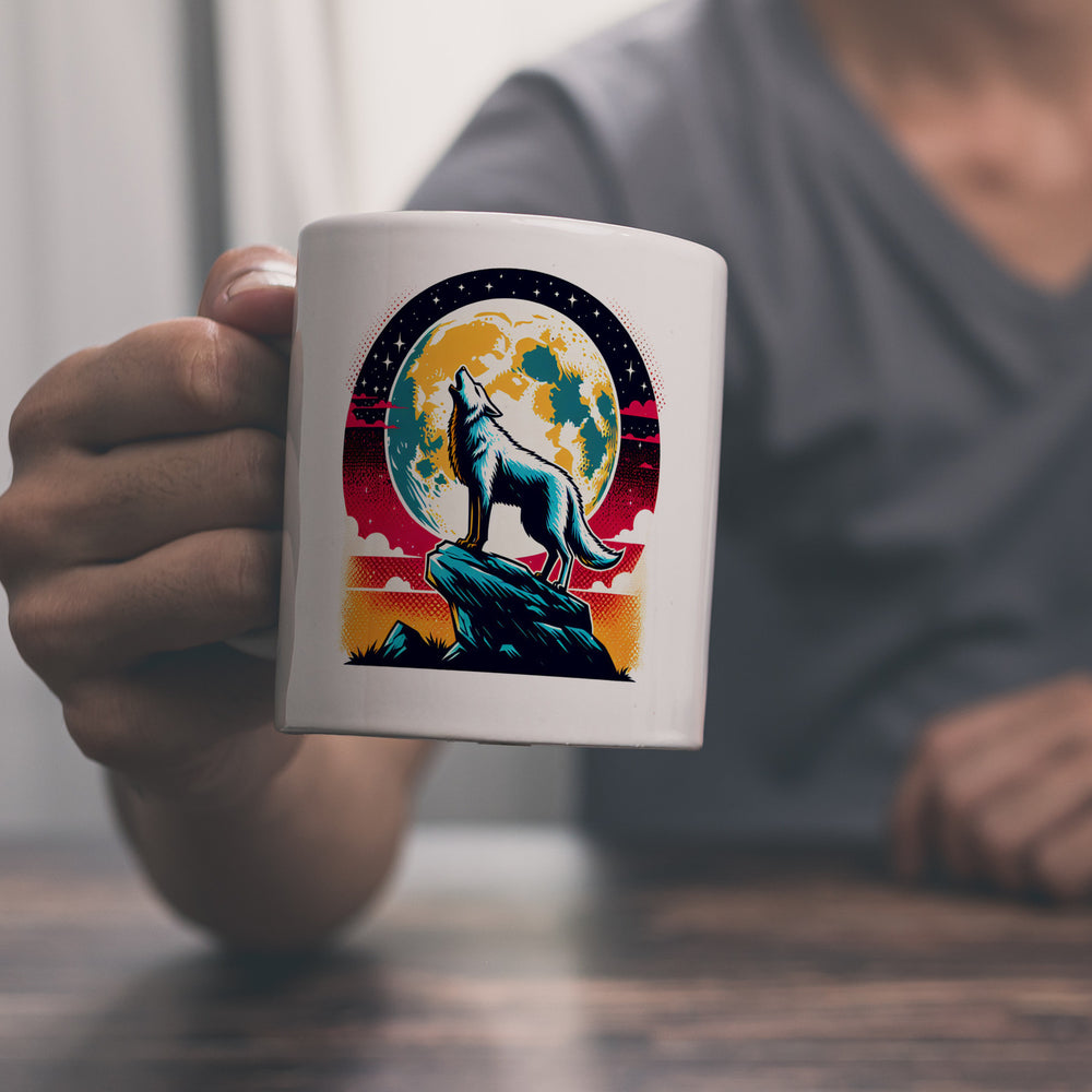 - Erwecke das wilde Raubtier in dir mit jedem Schlürfen aus dem "Wolf Vollmond Kaffeebecher"! Stell dir vor, wie bei Mondschein Canis lupus auf der Klippe steht und majestätisch heult – genau dieses Bild ziert in perfekter Silhouette Deine neue Kaffeepause.