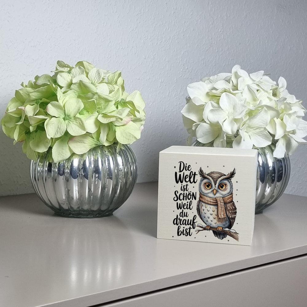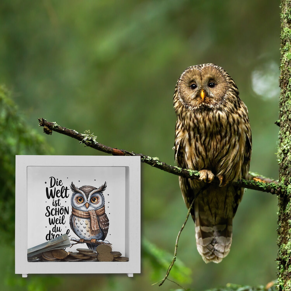Entdecke die zauberhafte Eule mit Schal Spardose: Ein charmanter Begleiter, der dein Sparen zu einer herzerwärmenden und lustigen Erfahrung macht! Diese einzigartige Spardose besticht durch ihr liebevoll gestaltetes Aquarelldesign, das eine niedliche Eule auf einem verschneiten Ast zeigt. Ihr beiger Schal und ihre funkelnden bernsteinfarbenen Augen werden alle Blicke auf sich ziehen. Die Eule trägt den berührenden Spruch DIE WELT IST SCHÖN WEIL DU drauf BIST und erinnert dich jeden Tag daran, dass du diesen Ort zu etwas Besonderem machst.Erhältlich in drei stilvollen Varianten – als schlichte Holzspardose, als hochwertige ovale Keramik-Version oder als exklusive Rahmen-Variante aus Holz mit Sichtfenster – passt sie perfekt zu deiner Einrichtung und macht jedes Geldgeschenk zu etwas Besonderem. Sorgfältig in unserer deutschen Manufaktur kreiert, ist diese Spardose ein Muss für alle Eulenliebhaber und Sparfüchse.Lass dich von dieser verspielten Eule dazu inspirieren, deine Ersparnisse stilvoll zu verwalten, während du deinem Zuhause einen Hauch von Winterdekoration verpasst. Ob als Geschenk für Kinder, die gerade das Sparen lernen, oder als charmantes Sammlerstück für Erwachsene – diese Spardose zaubert jedem ein Lächeln ins Gesicht und versprüht Freude mit Humor und Wärme. Hol dir jetzt einen bezaubernden Sparhelfer und mach die Welt ein bisschen schöner!