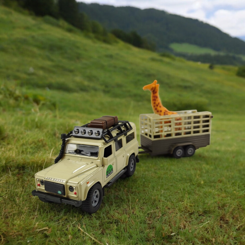 1x Safari Land Rover mit Anhänger Modellauto Defender Spielzeug mit Pull Back Motor bestehend aus 1x Defender, 1x Anhänger und 1x Giraffe.