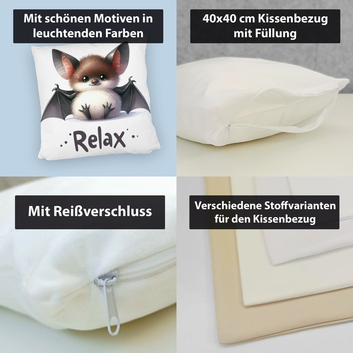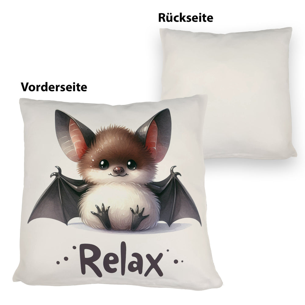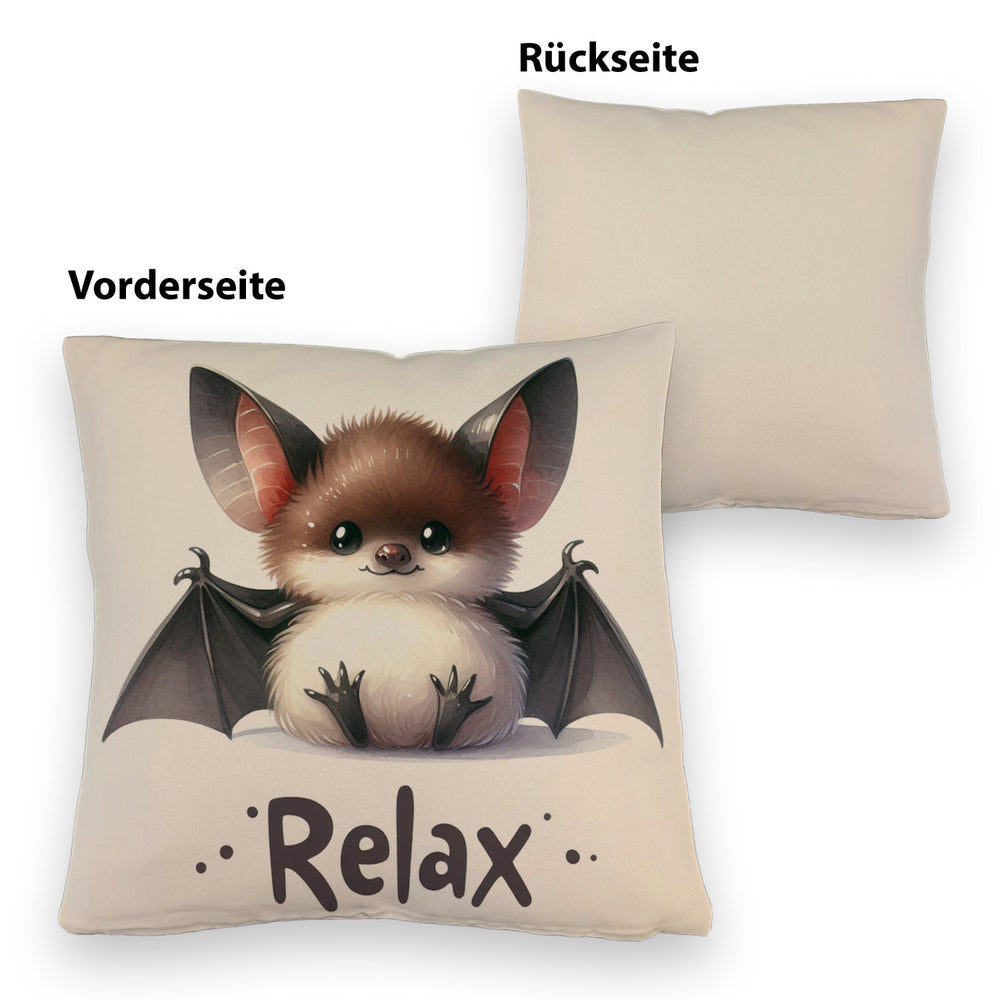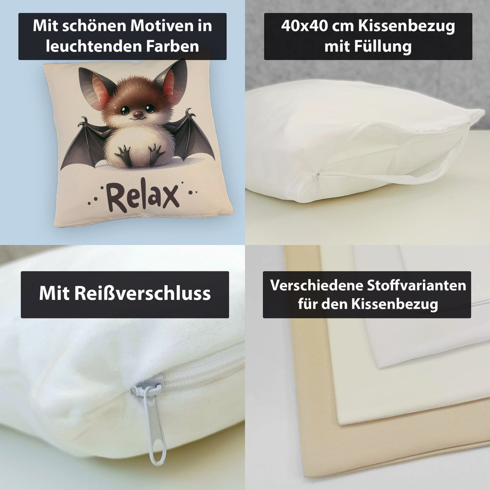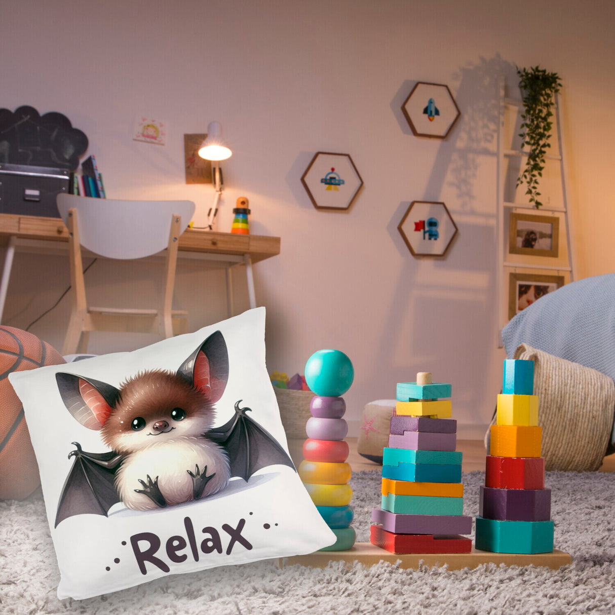 • 1x Baby Fledermaus Kissen mit Spruch Relax in der gewählten Ausführung
