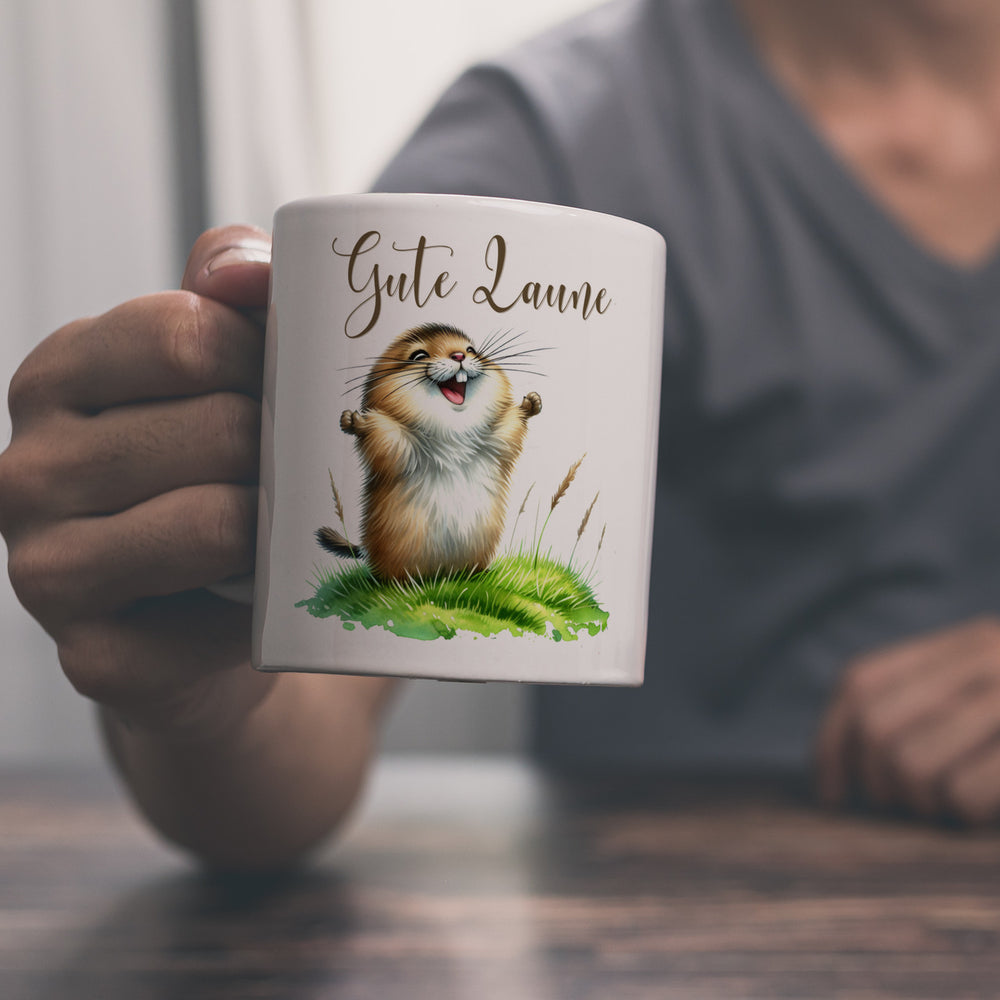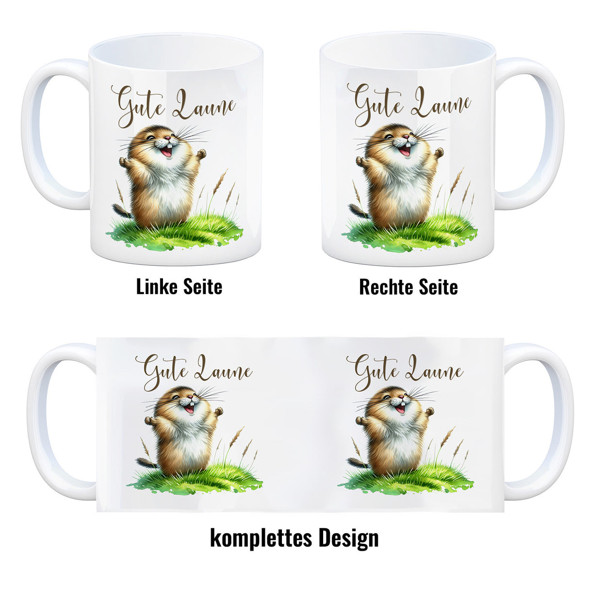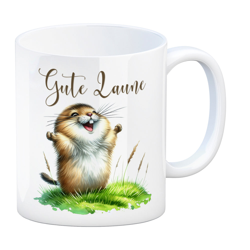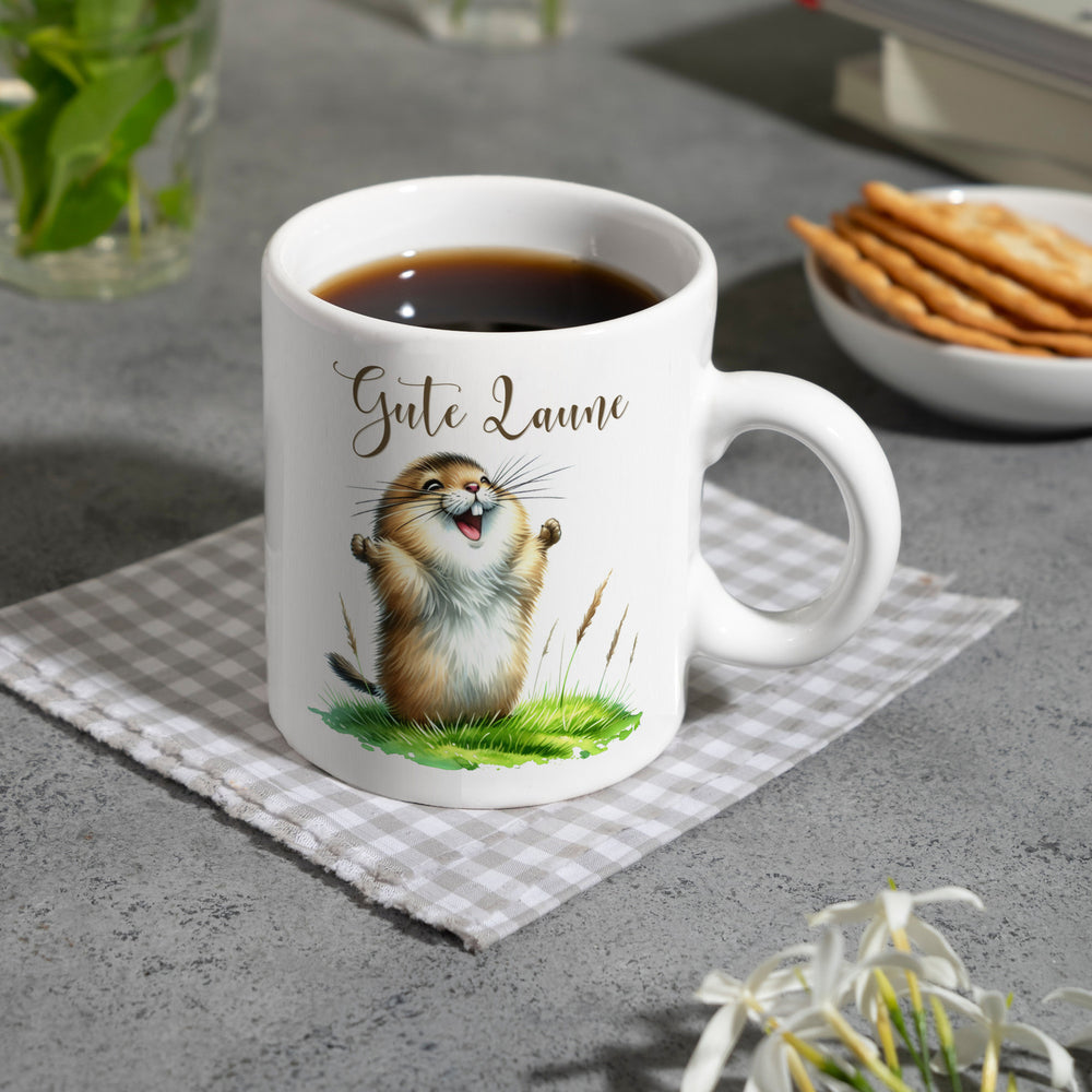 jubelnder Lemming Kaffeebecher mit Spruch Gute Laune