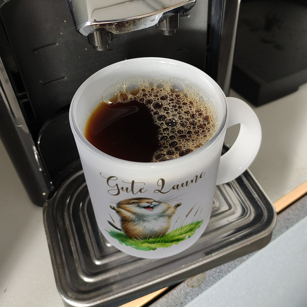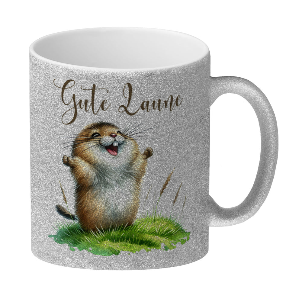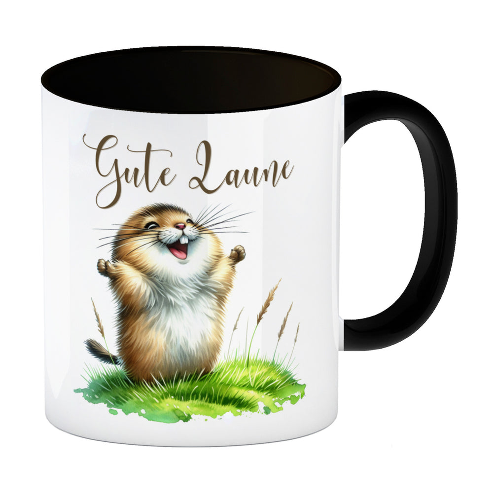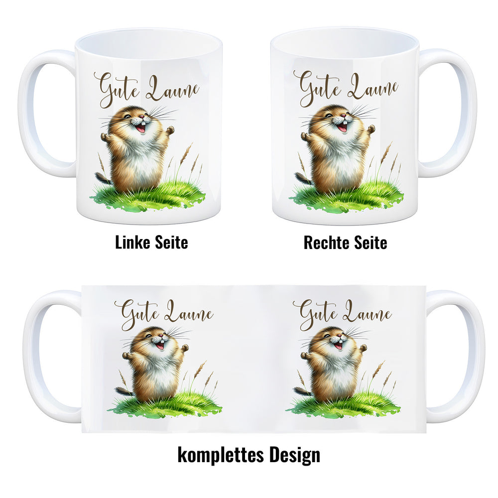 - 1x jubelnder Lemming Kaffeebecher mit Spruch Gute Laune in der gewählten Ausführung