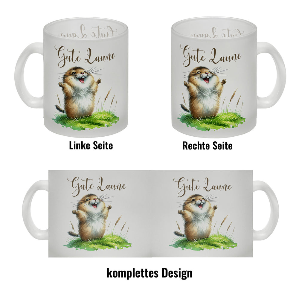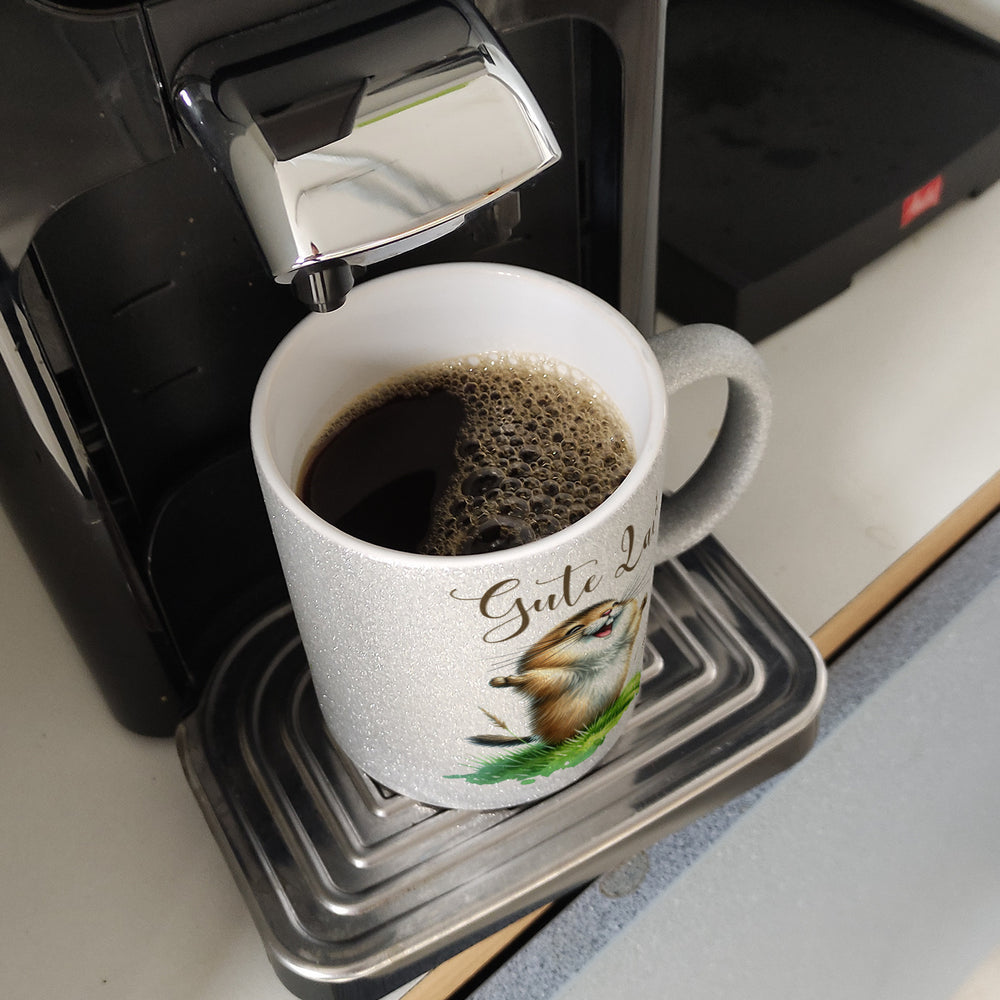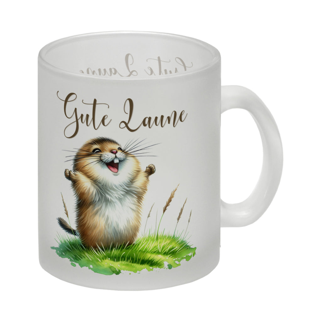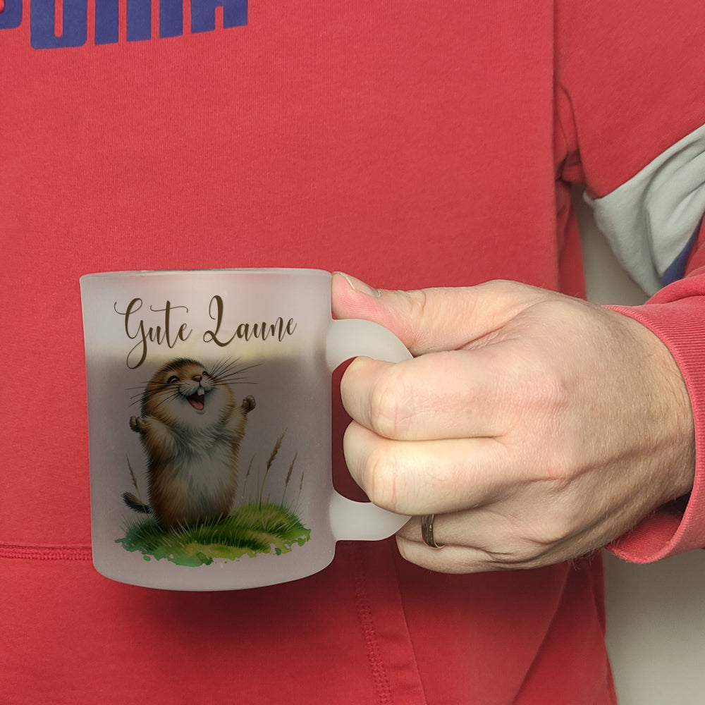 - 1x jubelnder Lemming Kaffeebecher mit Spruch Gute Laune in der gewählten Ausführung