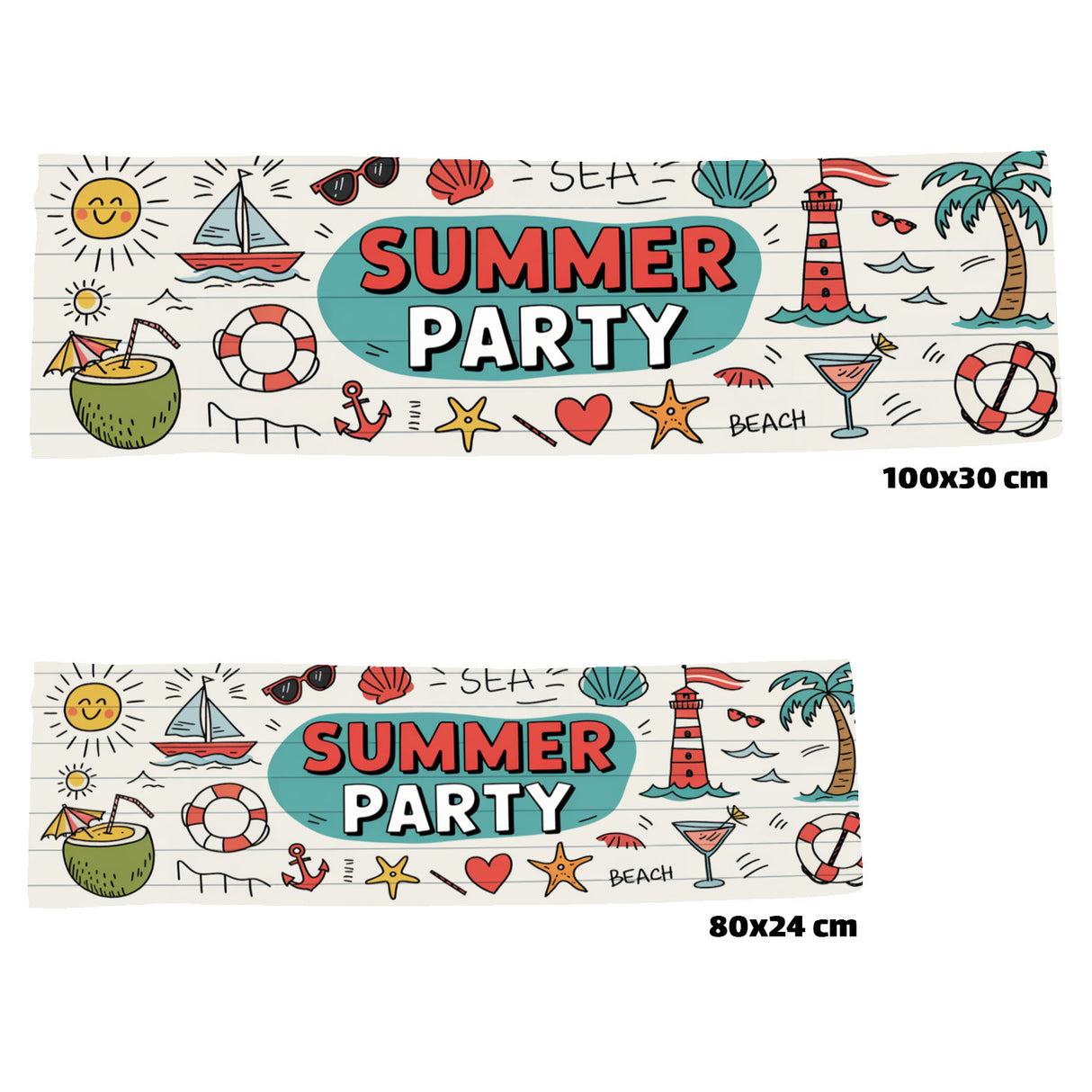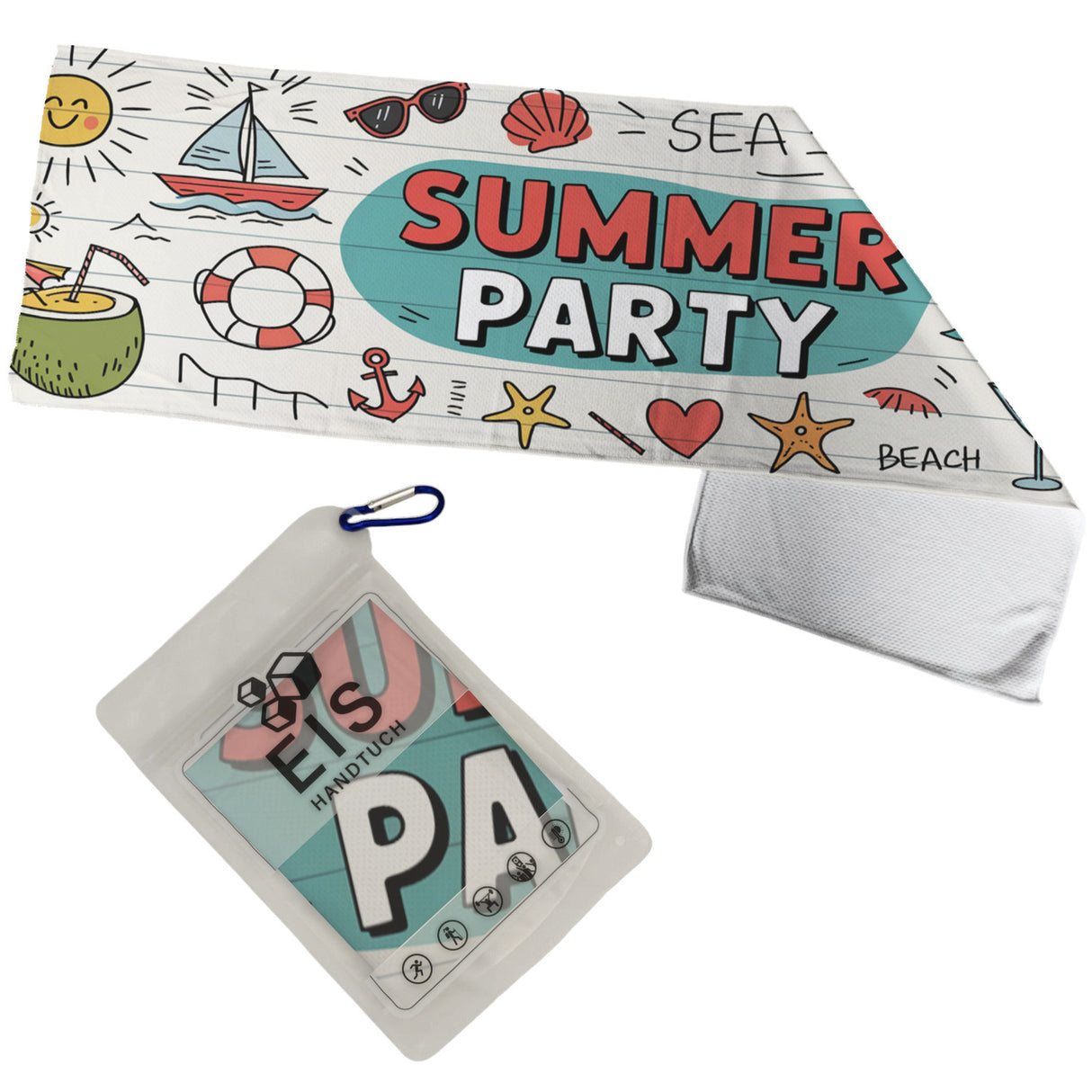 • Dieses Eishandtuch ist ein echter Hingucker! Mit einem fröhlichen Doodle-Design präsentiert es eine bunte Sommerparty auf weißem Holzplanken-Hintergrund. Von einer lächelnden Sonne und einem Segelboot über Palmen und Flip-Flops bis zum verführerischen Cocktailglas – hier ist alles dabei, was Sommerfreude bringt. Der große Text "SUMMER PARTY" strahlt in der Mitte.