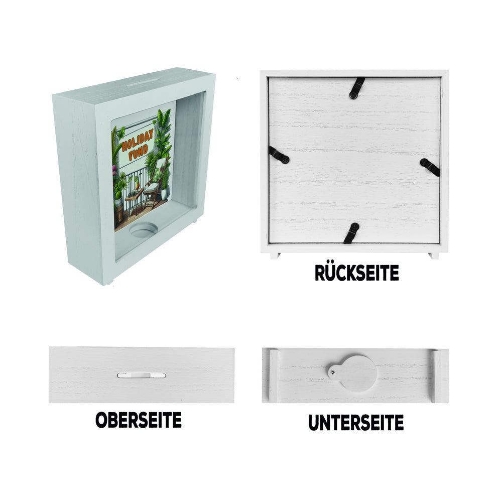 • Erhältlich in drei unterschiedlichen Varianten: Als schlichte Holzspardose, als hochwertige ovale Keramik-Version oder als exklusive Rahmen-Variante aus Holz mit Sichtfenster – perfekt für Geldgeschenke. Mit Sorgfalt bedruckt in unserer Spardosen-Manufaktur in Deutschland.