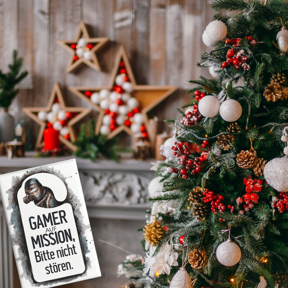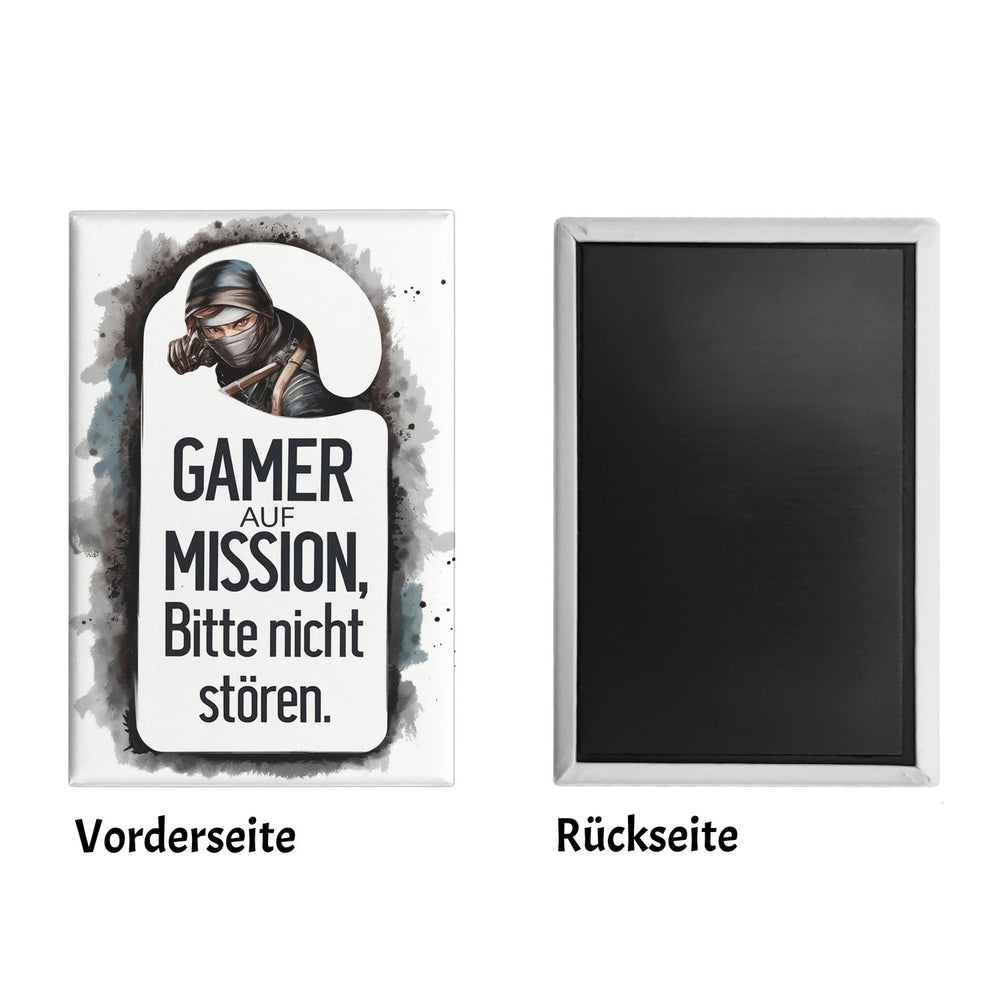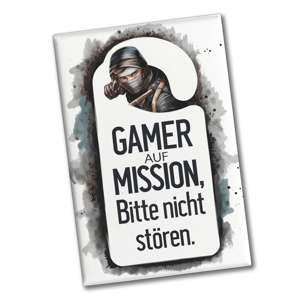 - Dieser rechteckige Magnet zeigt ein cooles Design auf weißem Hintergrund. In Pastellfarben steht in großen Buchstaben: "GAMER auf MISSION, bitte nicht stören". Der Charakter, vermutlich ein Gamer, schleicht wie in einem Stealth-Spiel umher. Mit Kapuze, Maske und Waffe bringt er Gamer-Feeling direkt an deinen Kühlschrank!