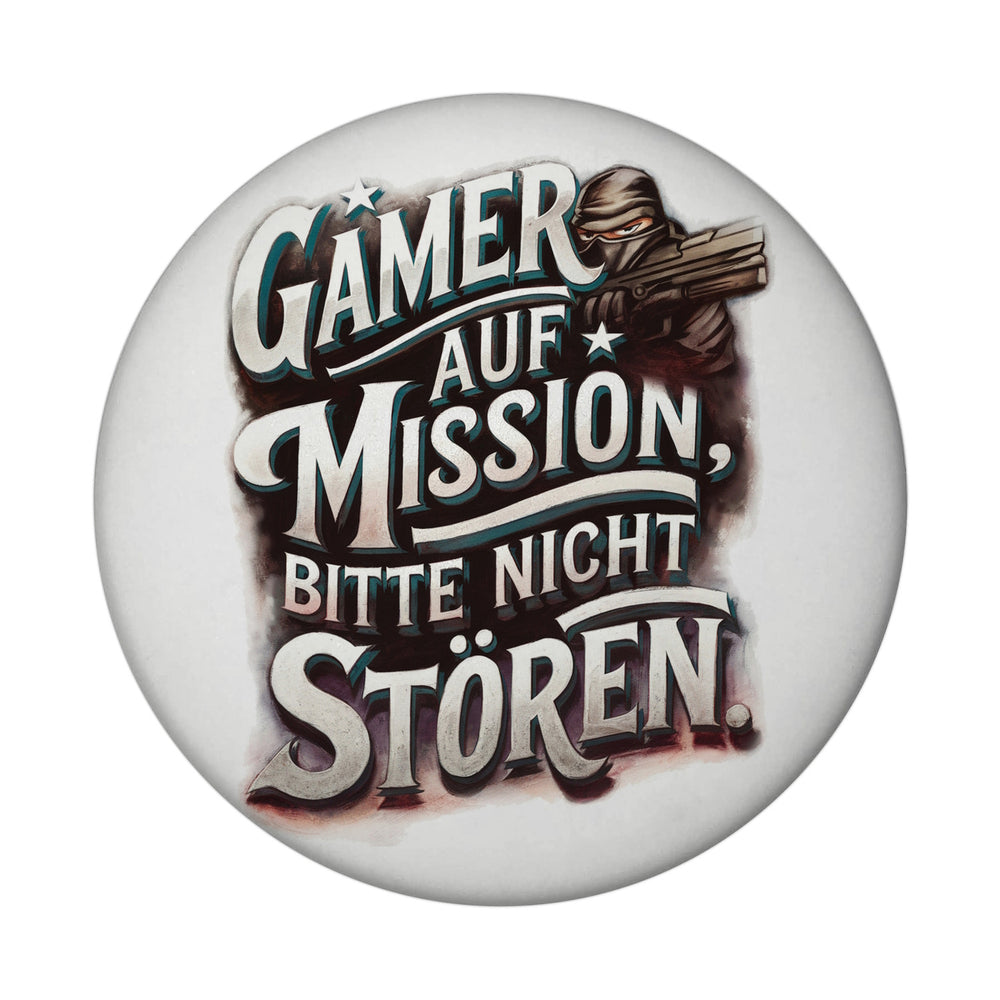- Der runde Magnet zeigt ein einzigartiges Gamer auf Mission Motiv. Auf weißem Hintergrund tanzt ein stilisierter, schleichender Gamer mit einer Waffe in Aquarell-Pastelltönen. Nur die Augen sichtbar, tief im Spiel versunken. Der Text: GAMER AUF MISSION, BITTE NICHT STÖREN, springt in fetten und kursiven Buchstaben ins Auge.