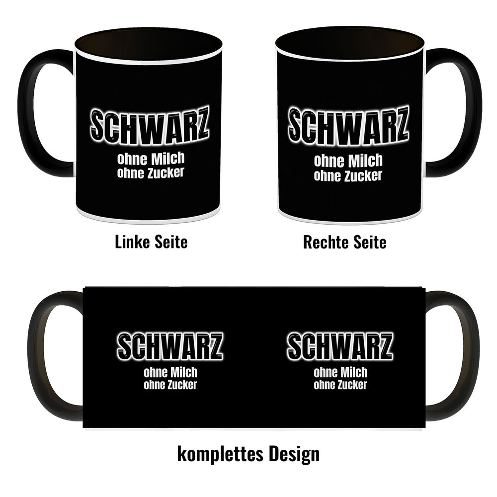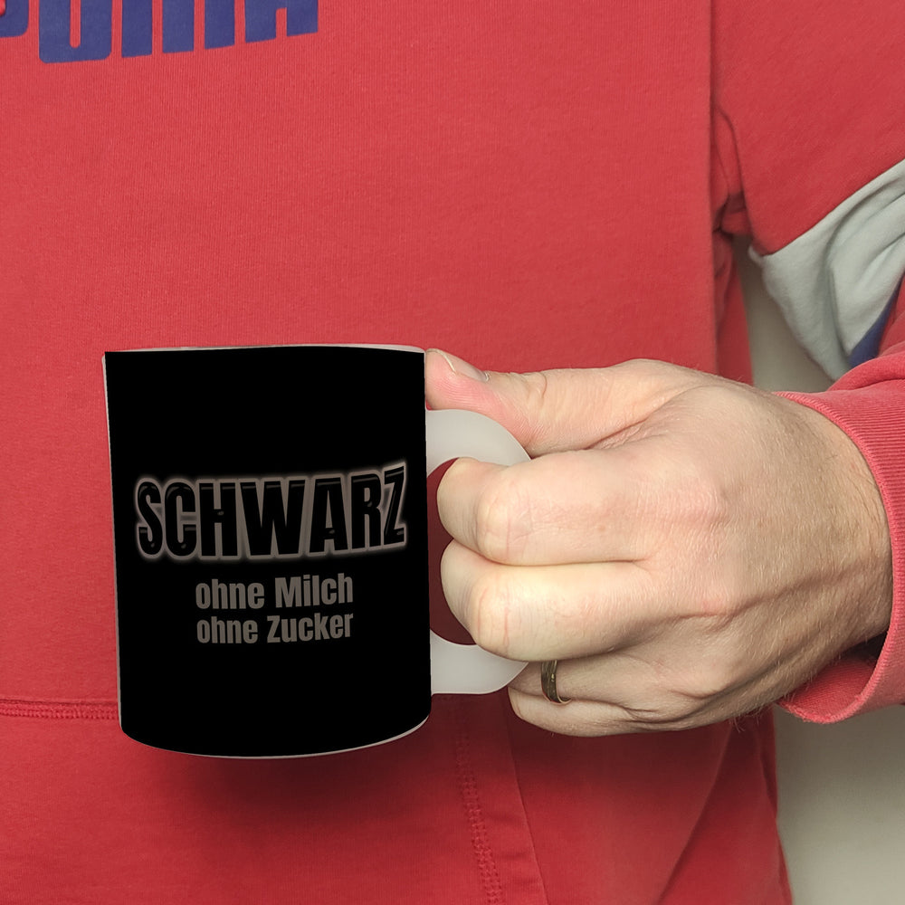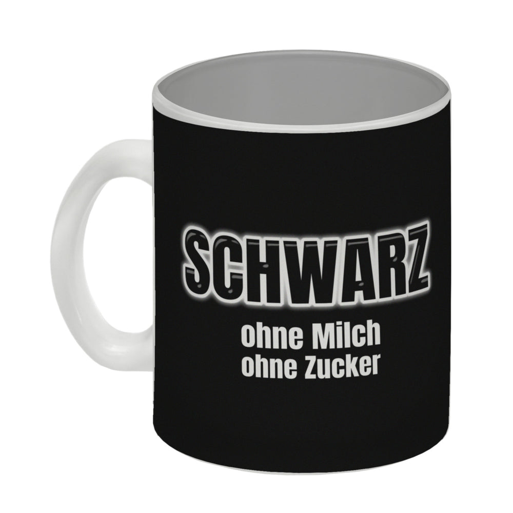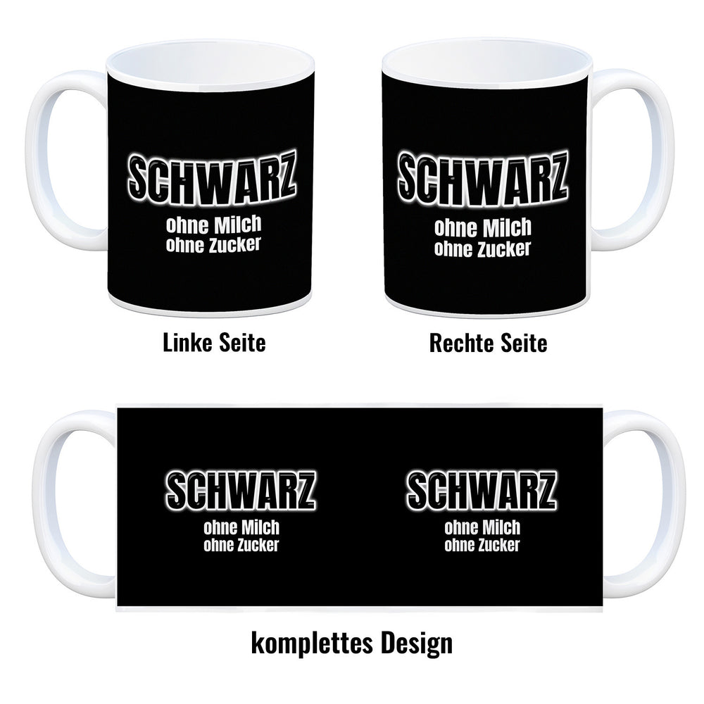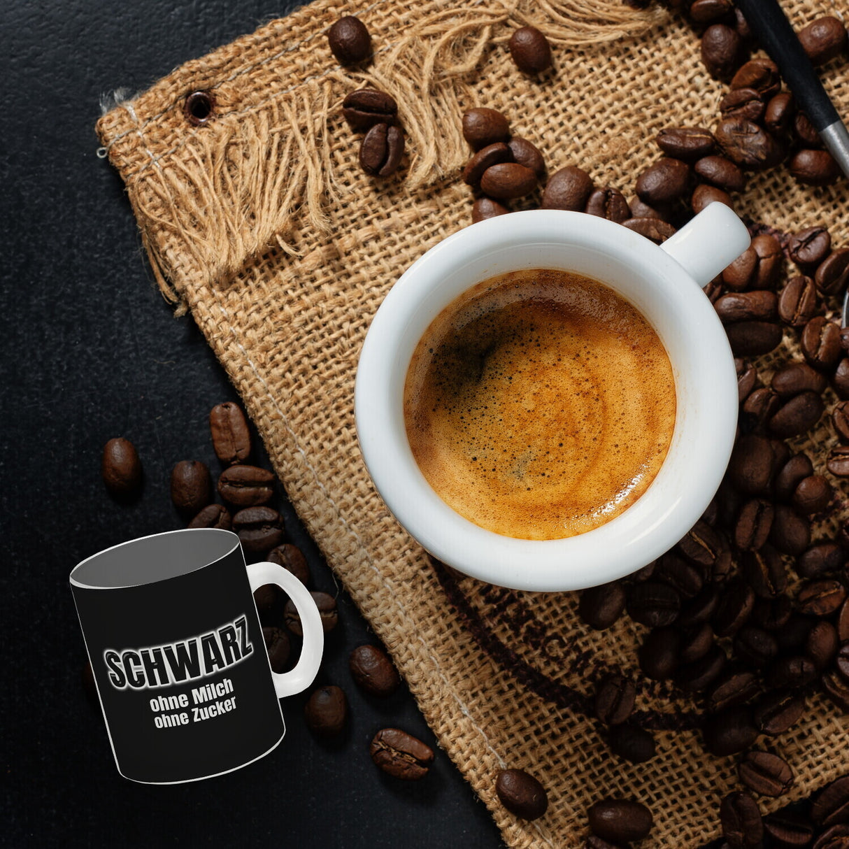 Kaffeebecher mit Spruch SCHWARZ ohne Milch ohne Zucker für Koffeinjunkies