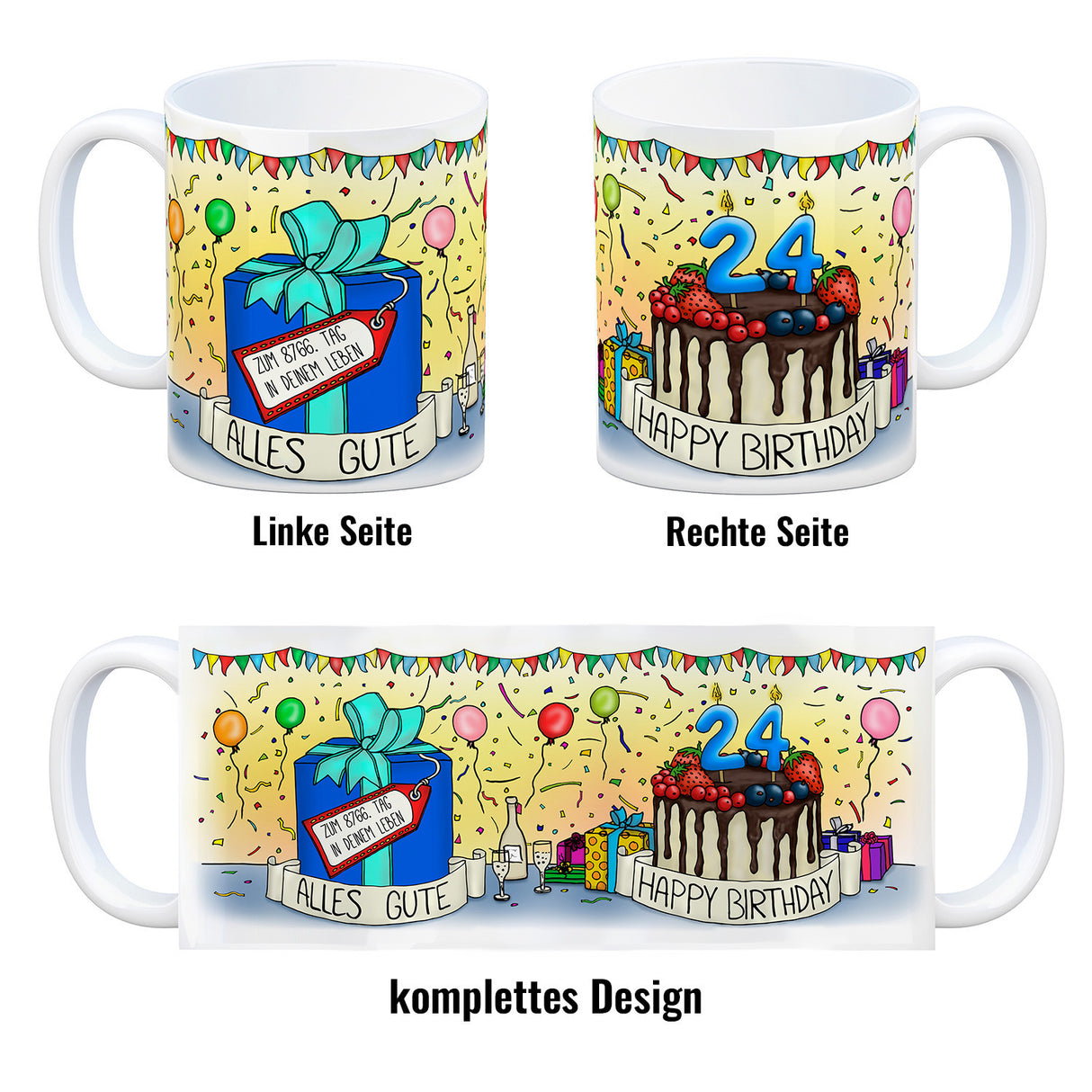 24. Geburtstag Tasse mit Kuchen und Geschenk und Anhänger: zum 8766. Tag