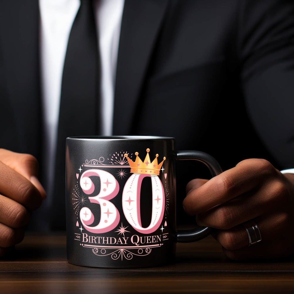 - Goldene Sterne und Herzen umrahmen die magische 30, während „Birthday Queen“ stolz darunter prangt. Der schwarze Hintergrund sorgt für einen edlen Kontrast, der die Farben perfekt in Szene setzt. Dein Kaffee war noch nie so majestätisch!