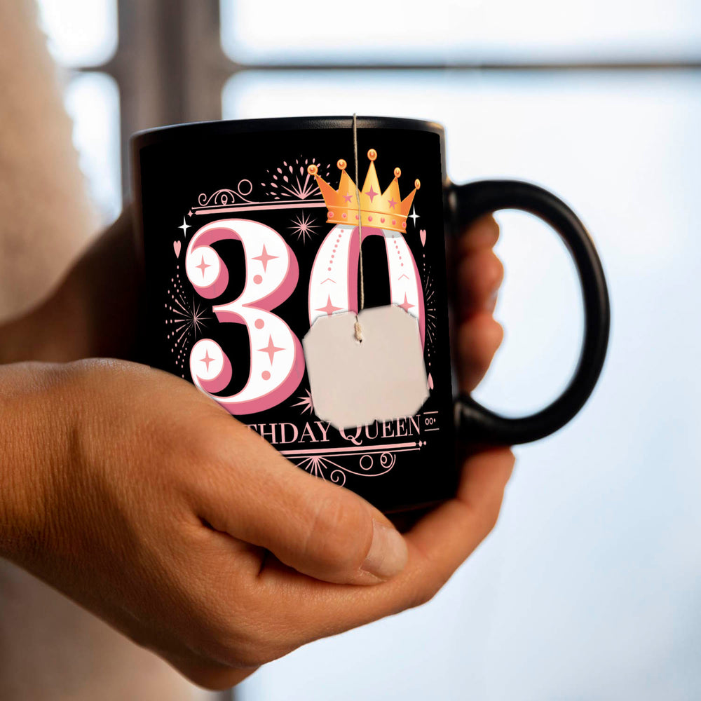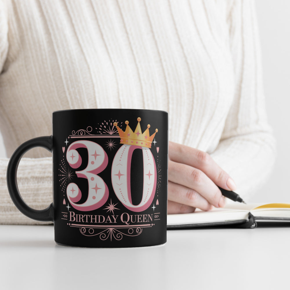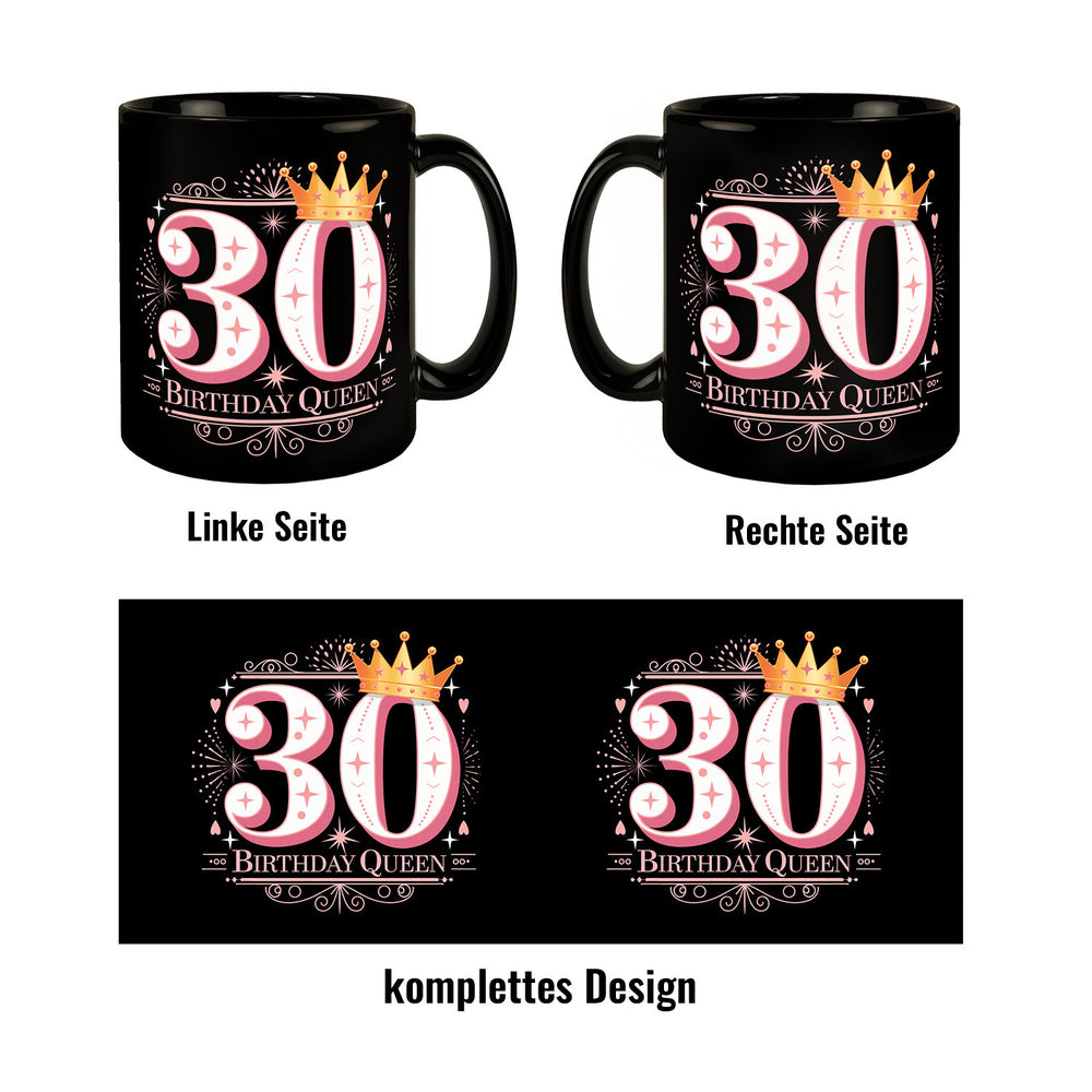 - Happy 30th, Birthday Queen! Diese schicke schwarze Tasse macht Dich zur unangefochtenen Königin des Alltags. Mit bunten Buchstaben und einer funkelnden goldenen Krone wird jede Kaffeepause zur royalen Zeremonie.