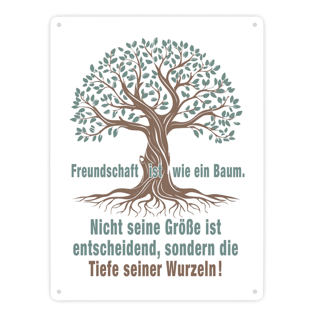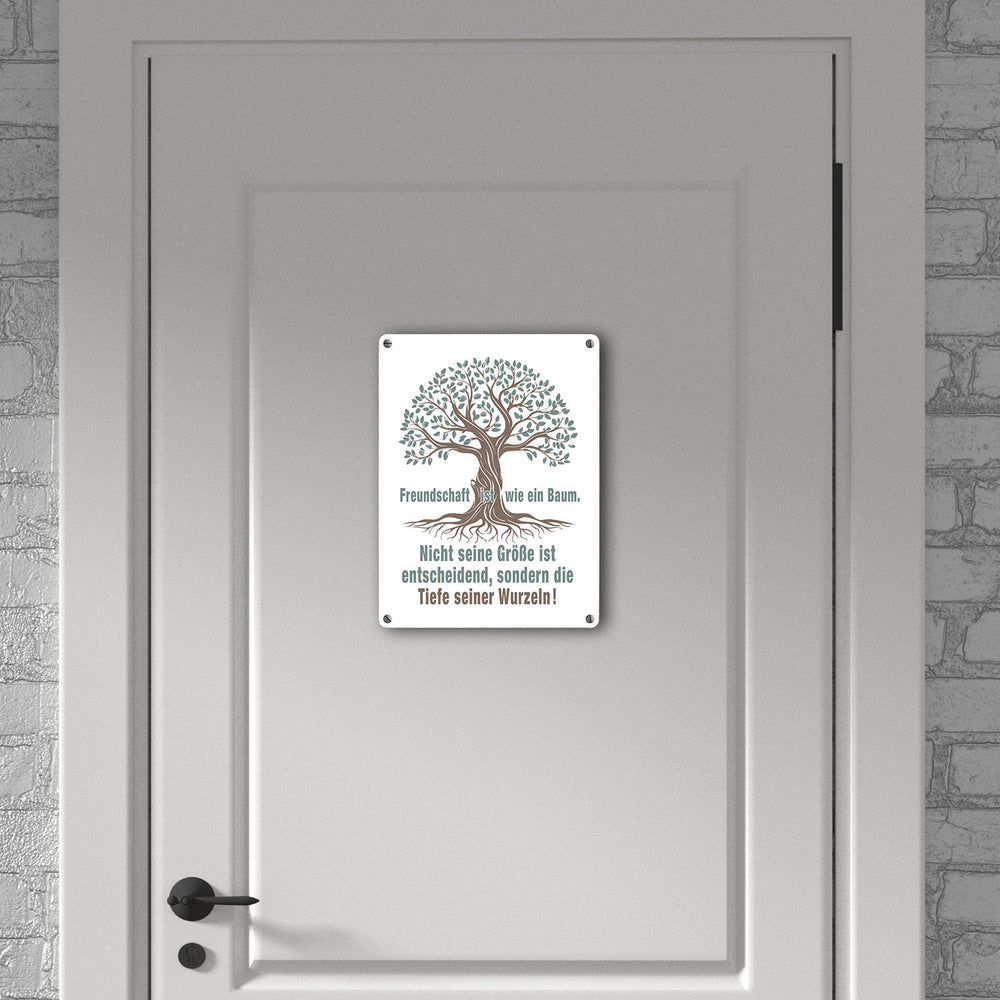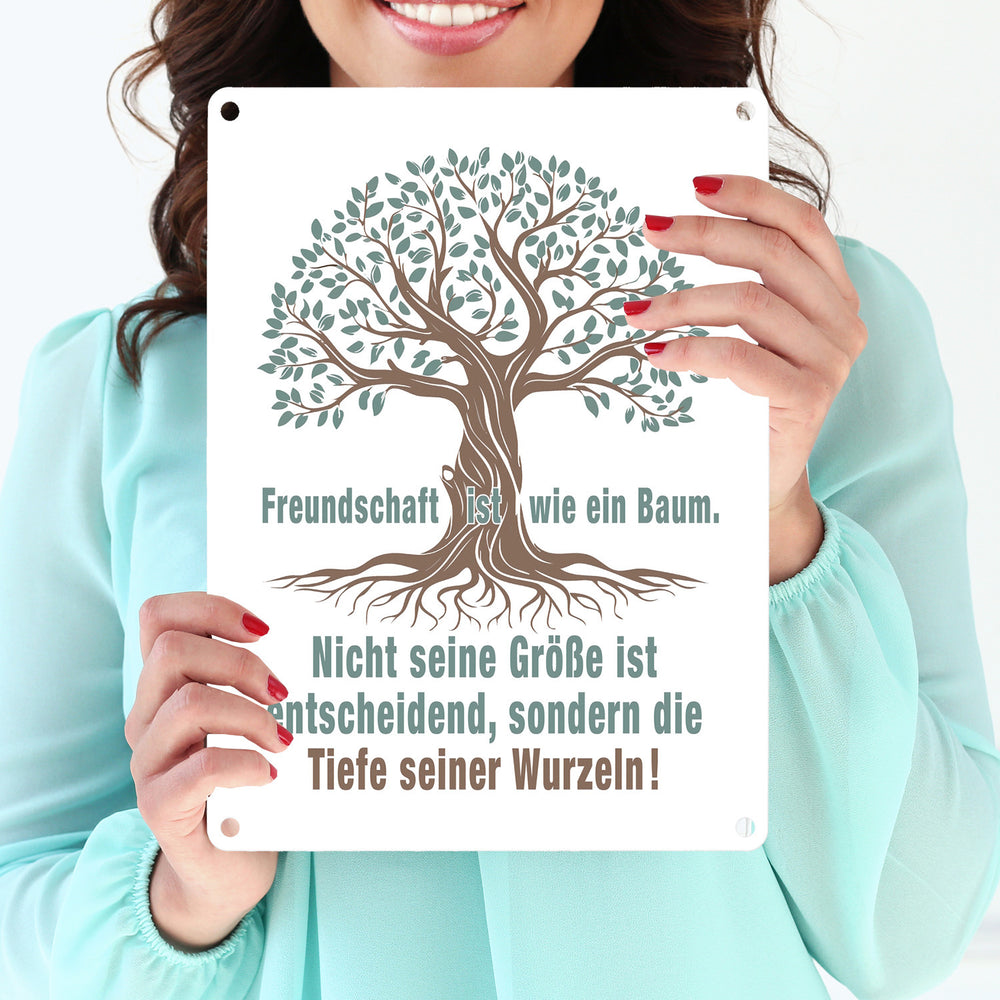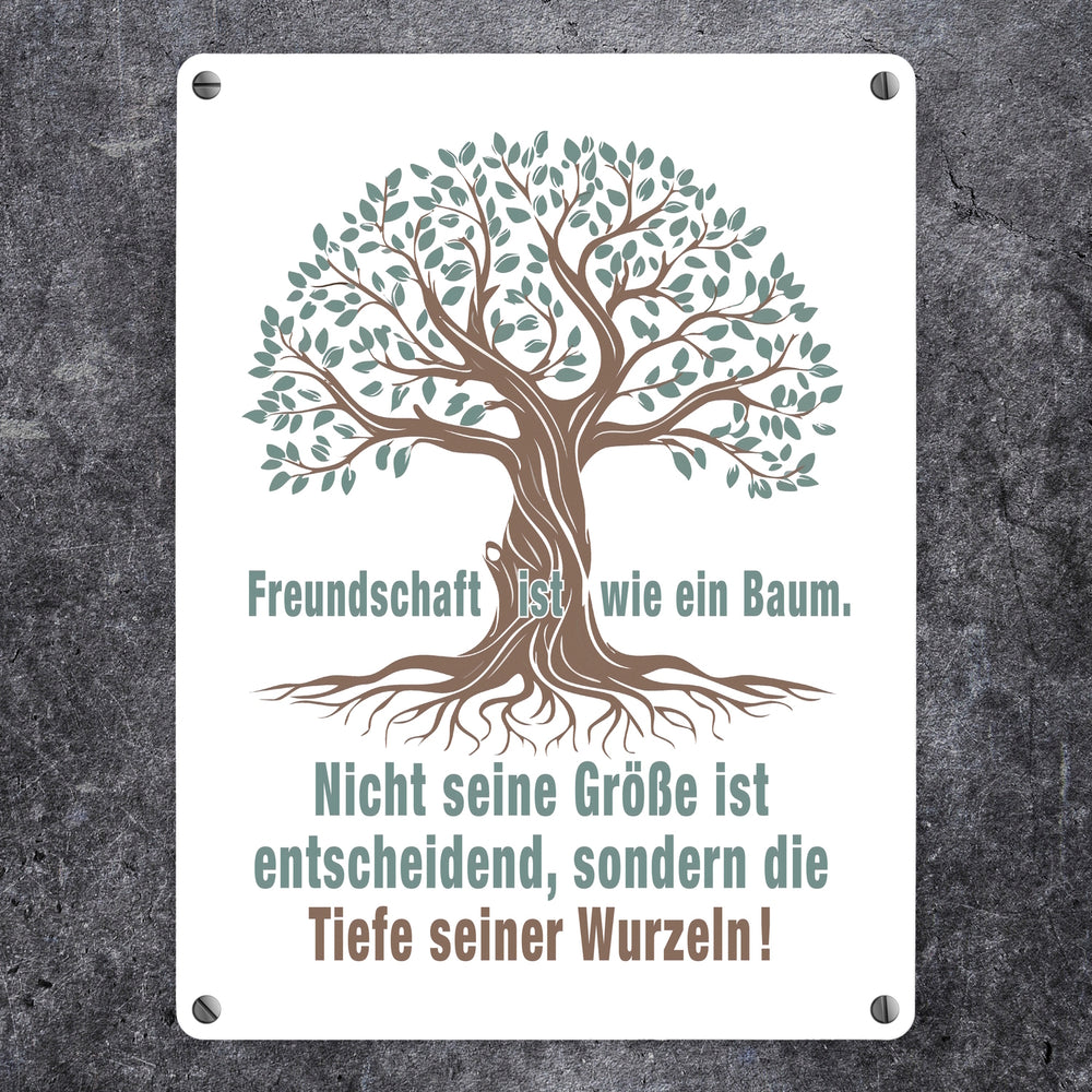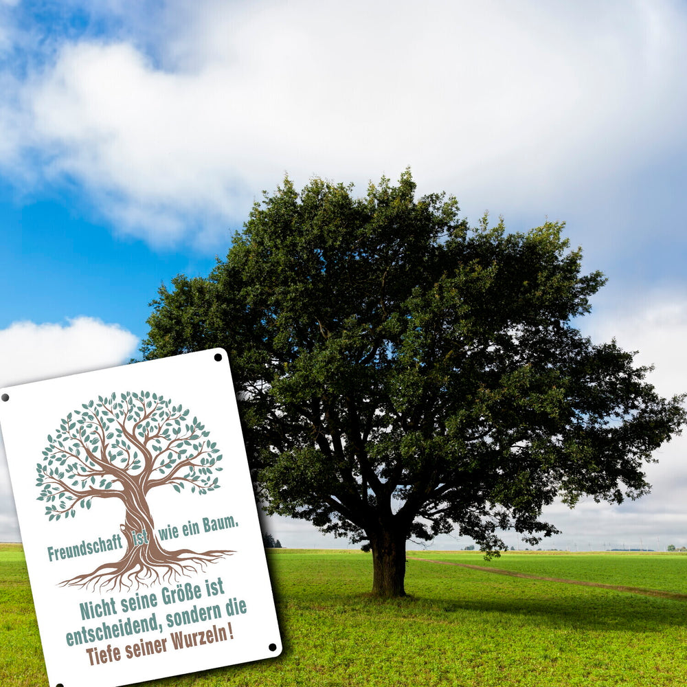 - Das Metallschild zeigt einen kunstvoll gestalteten Baum mit tiefen Wurzeln. Der Baum symbolisiert Stärke und Beständigkeit. Der eingravierte Spruch „Freundschaft ist wie ein Baum. Nicht seine Größe ist entscheidend, sondern die Tiefe seiner Wurzeln!“ macht es zu einem einzigartigen Deko-Artikel für jeden Raum.