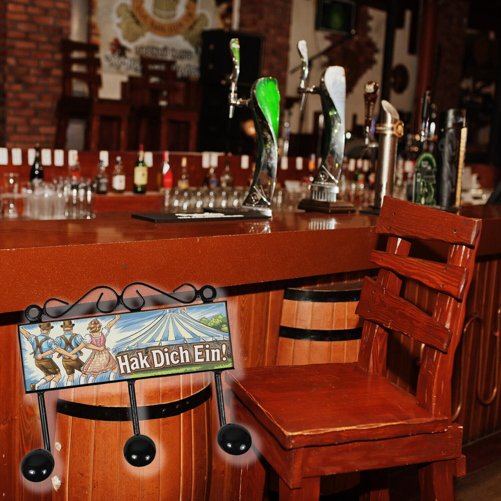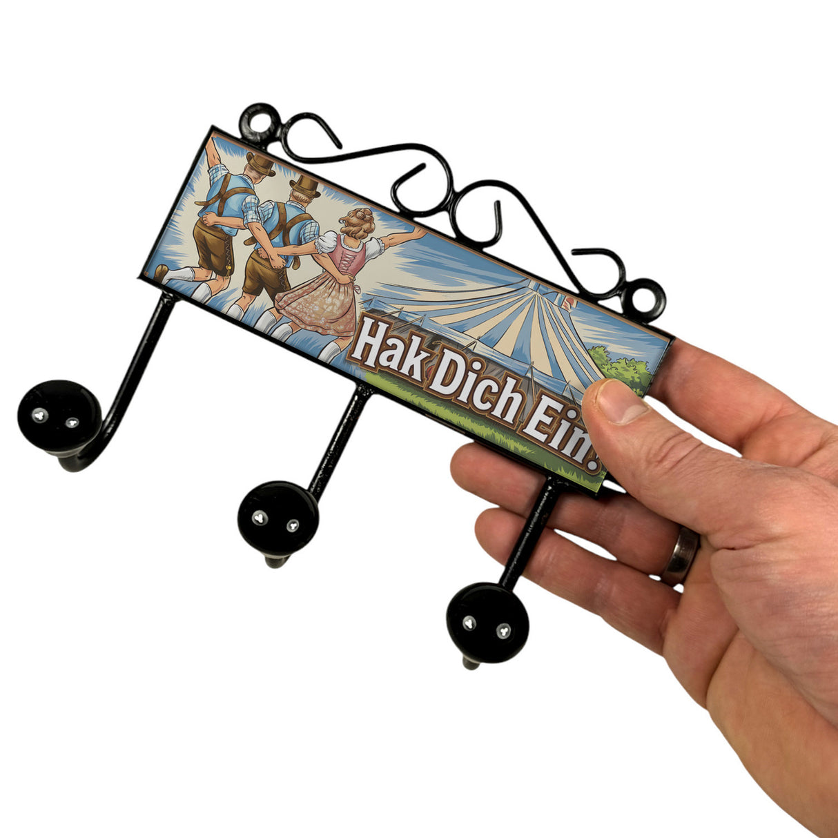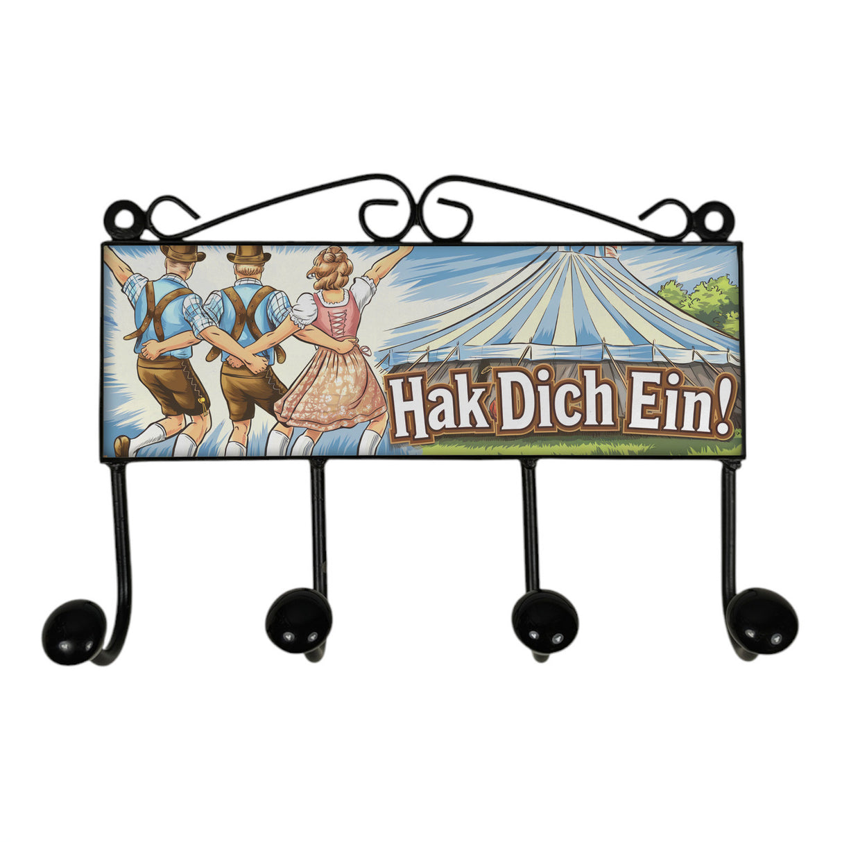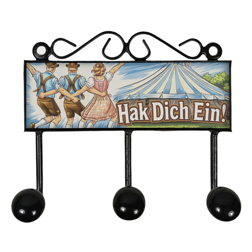 - Diese Kleiderhakenleiste bezaubert mit einer humorvollen Illustration zweier Männer und Frauen in bayerischer Tracht, die Lederhosen und Dirndl tragen. Die Rückansicht zeigt die fröhlichen Gesellen im typischen Festzelt-Ambiente. Der Spruch "Hak dich ein!" prangt in fetten Lettern und bringt Schwung in jede Wand. Ein Must-have für Trachtenfans!