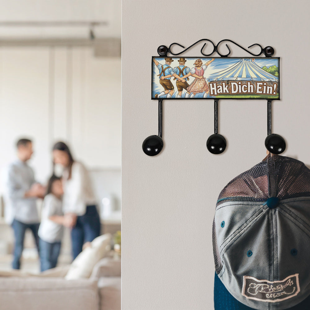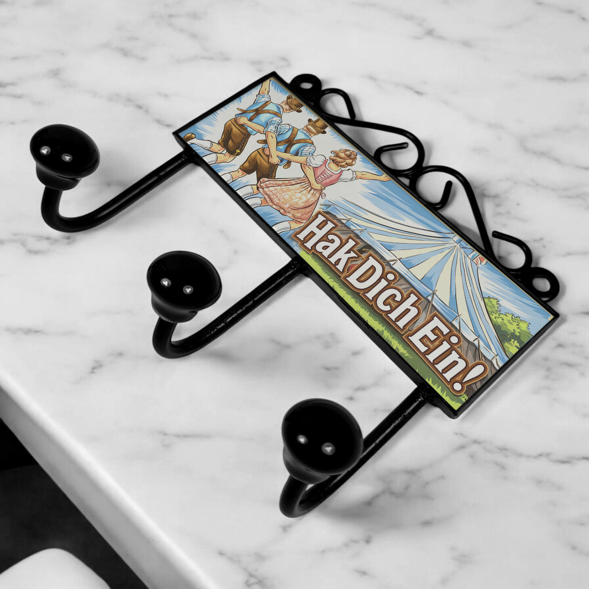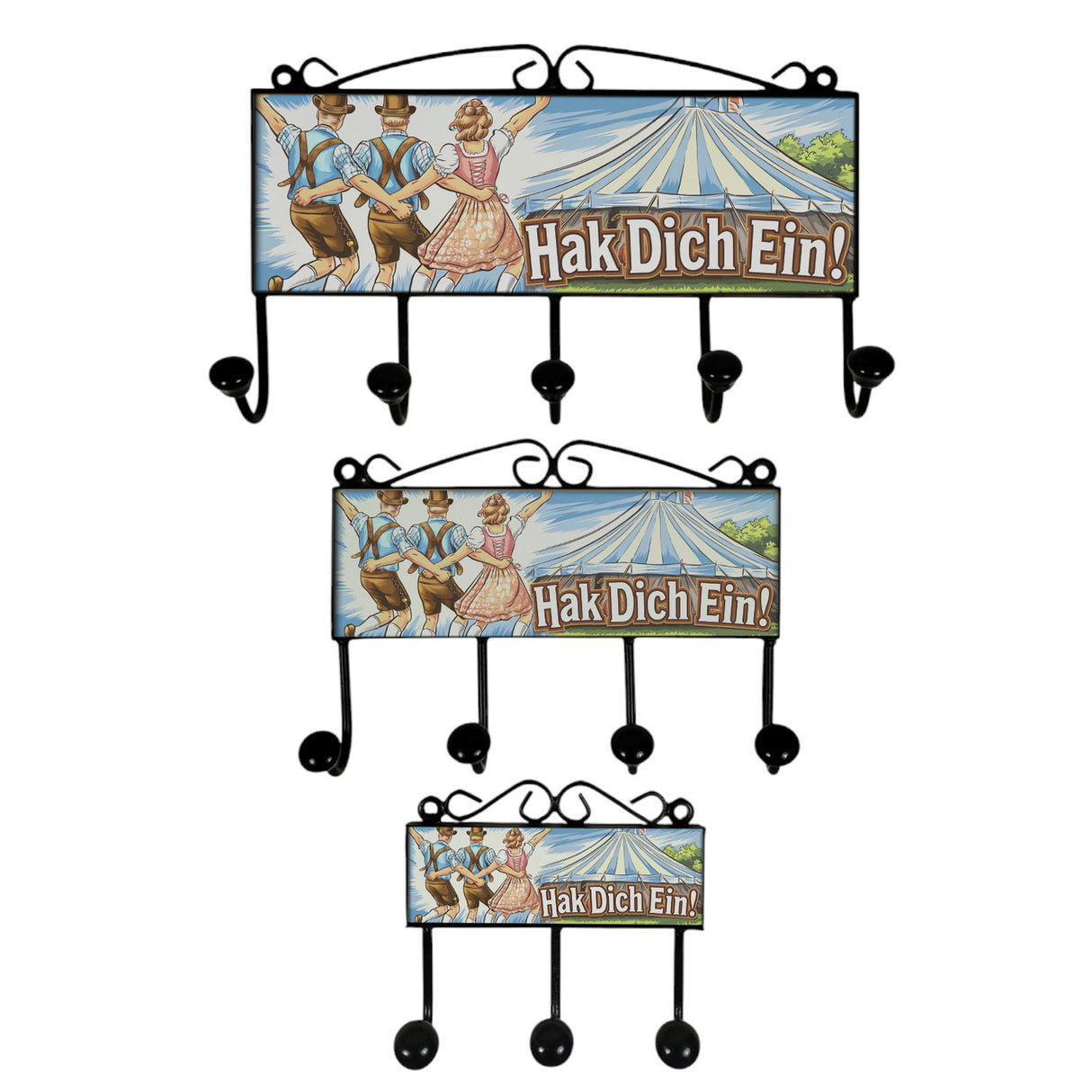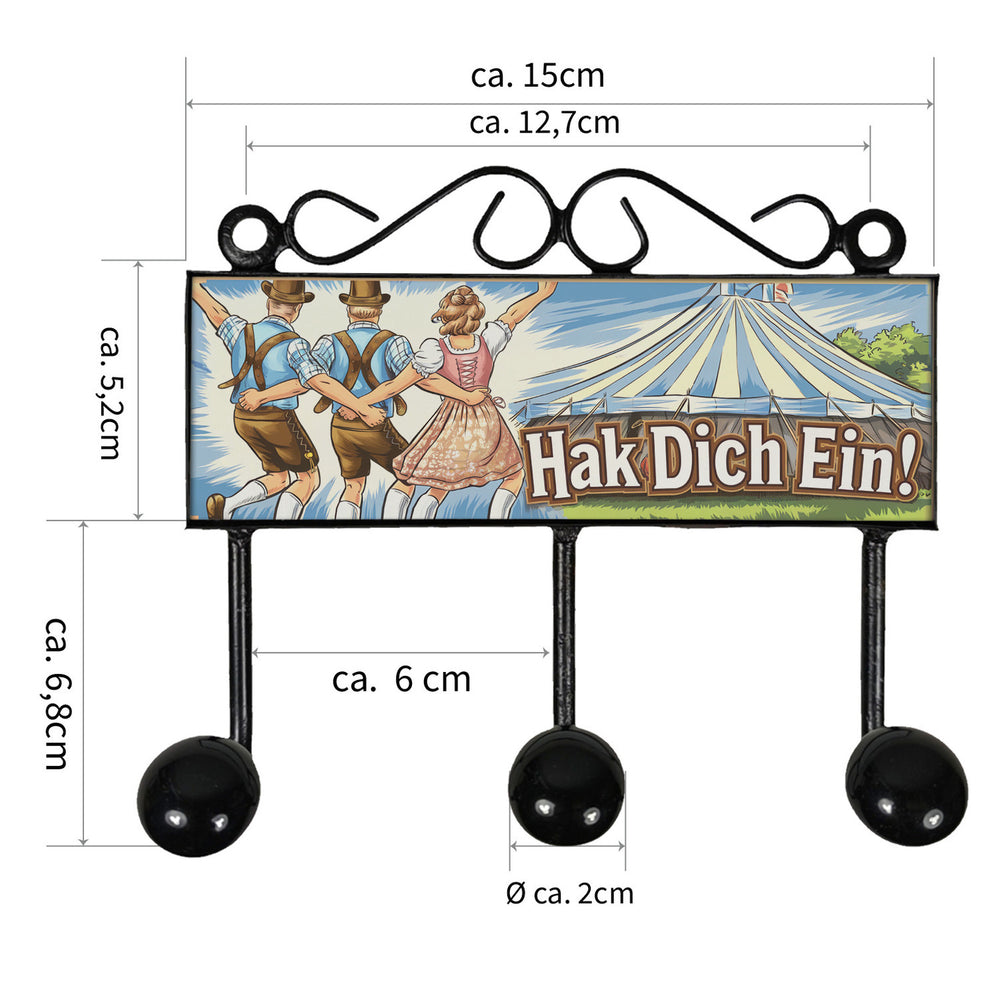 - Diese Kleiderhakenleiste bezaubert mit einer humorvollen Illustration zweier Männer und Frauen in bayerischer Tracht, die Lederhosen und Dirndl tragen. Die Rückansicht zeigt die fröhlichen Gesellen im typischen Festzelt-Ambiente. Der Spruch "Hak dich ein!" prangt in fetten Lettern und bringt Schwung in jede Wand. Ein Must-have für Trachtenfans!
