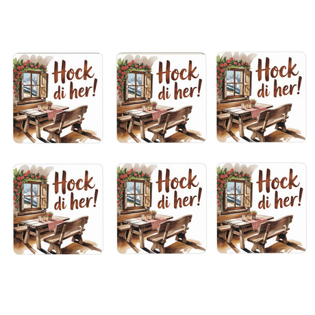 - Dieses 6er Set aus hölzernen Untersetzern bringt den Charme einer Zillertal Almstube direkt auf Ihren Tisch. Mit einem rustikalen Holzbank- und Fenstermotiv im Aquarellstil strahlen sie alpine Gemütlichkeit aus. Der einladende Spruch "Hock di her!" verleiht dem Set eine persönliche, humorvolle Note.