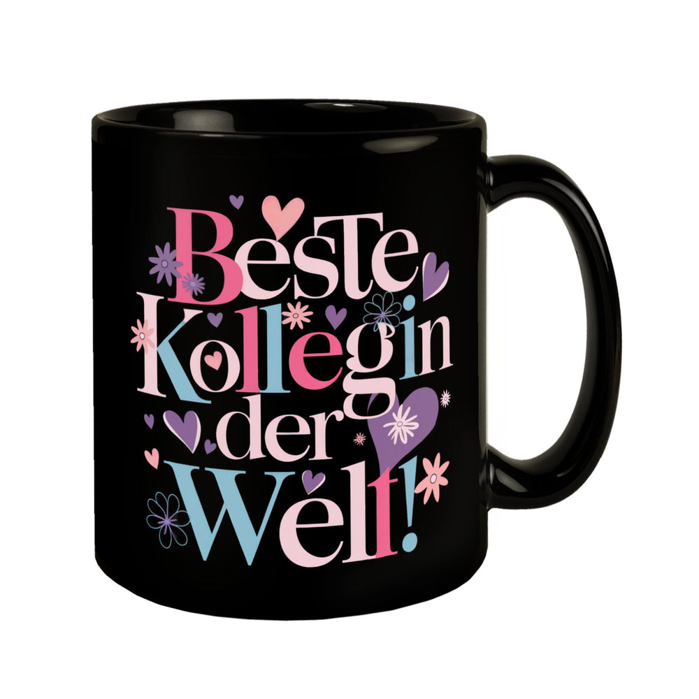 - Diese Kaffeetasse ist so schwarz wie dein Humor am Montagmorgen! Mit dem leuchtenden "Beste Kollegin der Welt"-Motiv in knalligem Pink, Violett und Blau, fühlst du dich bei jedem Schluck Kaffee wie die Queen des Büros.