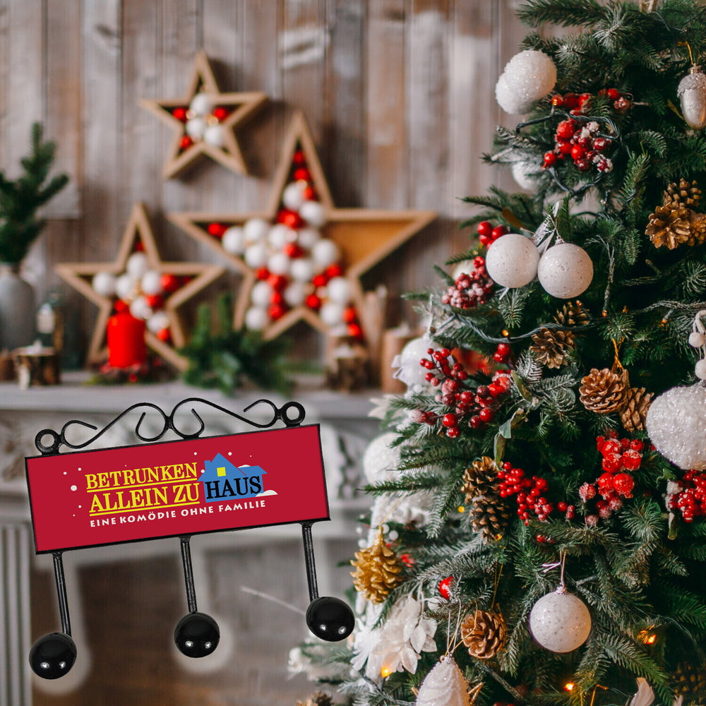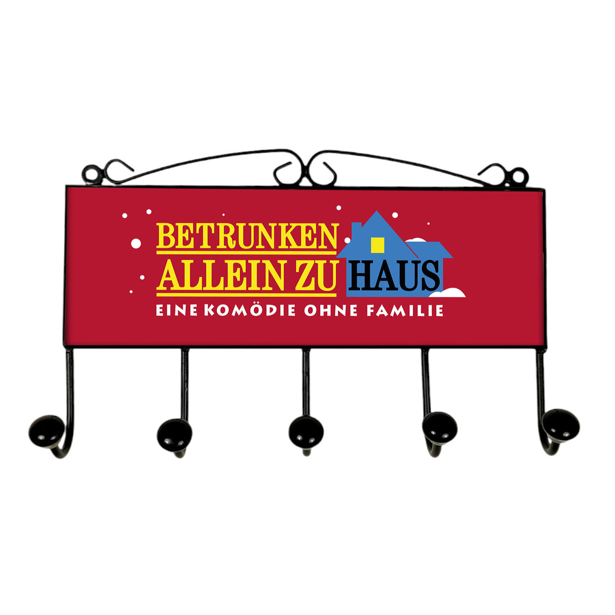 - Diese humorvolle Kleiderhakenleiste erstrahlt in lebendigem Rot mit einem frechen Spruch in weißem Text: "BETRUNKEN ALLEIN ZU HAUS". Der Zusatz "EINE KOMÖDIE OHNE FAMILIE" in schwarzem Text darunter setzt noch einen drauf. Neben dem Text thront eine blaue Hausgrafik auf schneebedecktem Hintergrund – perfekt für einen Lacher!