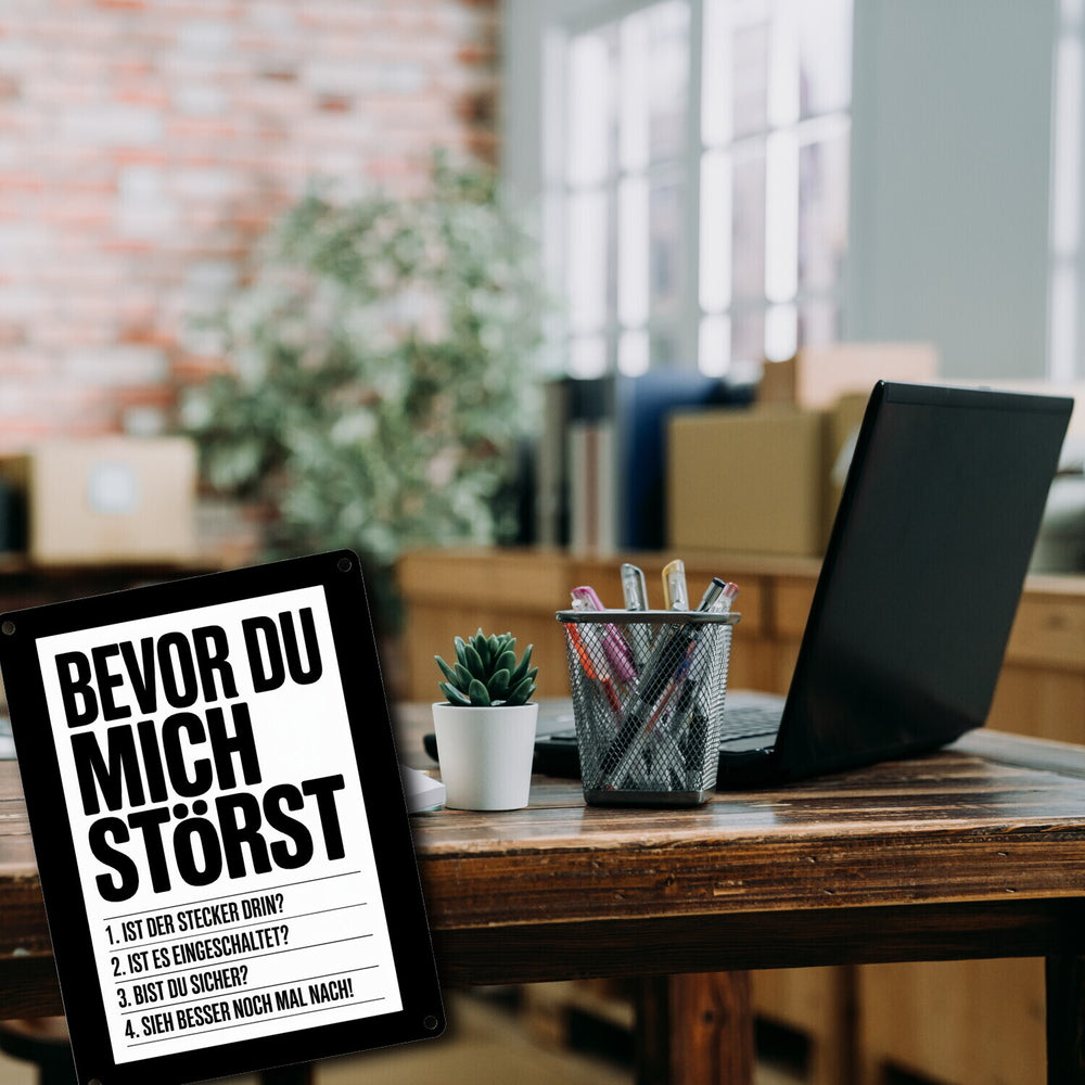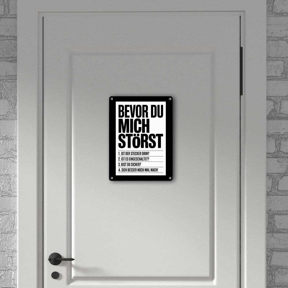 - Dieses Metallschild besticht durch ein markantes, grafisches Design auf schwarzem Hintergrund. Die auffällige Typografie hebt den Text "BEVOR DU MICH STÖRST" hervor und führt zu einer Liste mit humorvollen Fragen. Perfekt für IT-Profis, die eine klare Botschaft senden möchten. Es ist robust und langlebig und ein echter Hingucker!