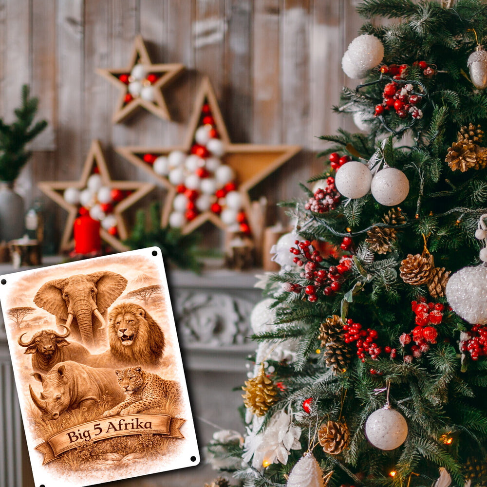 - Das Big 5 Afrika Metallschild besticht durch eine detailreiche, sepiafarbene Illustration der majestätischen „Big 5“: Elefant, Büffel, Löwe, Nashorn und Leopard. Die majestätische Savannenlandschaft und das natürliche Savannengras vervollständigen das authentische afrikanische Motiv. Perfekt für Tierliebhaber und Fans von exotischer Wanddekoration!
