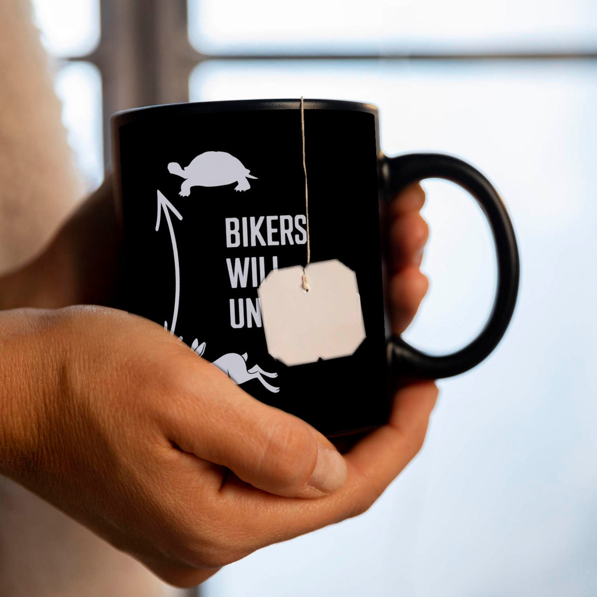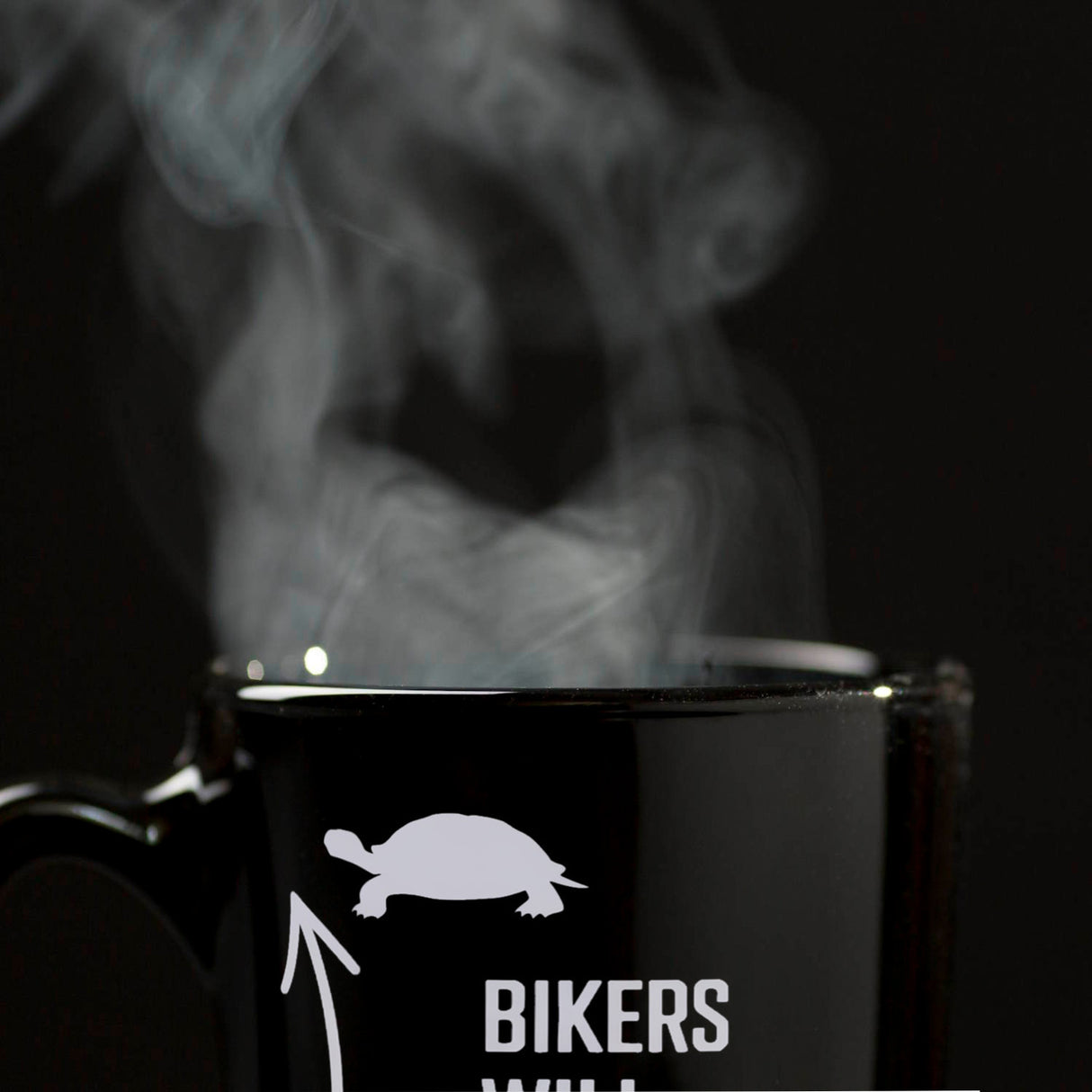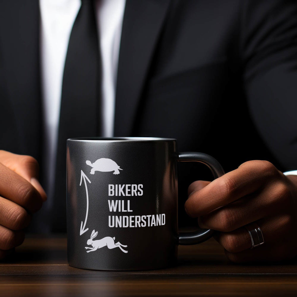 - Die "Bikers will understand" Tasse ist ein schwarzes Kunstwerk für Motorradfahrer. Mit einer lustigen Silhouette einer Schildkröte oben und einem rennenden Hasen unten, garniert mit einem geschwungenen Doppelpfeil. In silberner Schrift prangt der humorvolle Spruch, der Motorradfahrer zum Schmunzeln bringt.