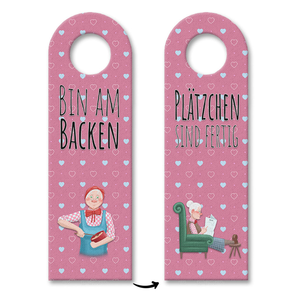 - 1x Bin am backen oder Plätzchen sind fertig lustiger Türhänger mit Oma Motiv in der gewählten Setgröße
