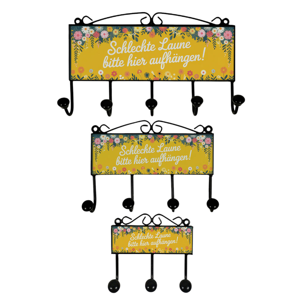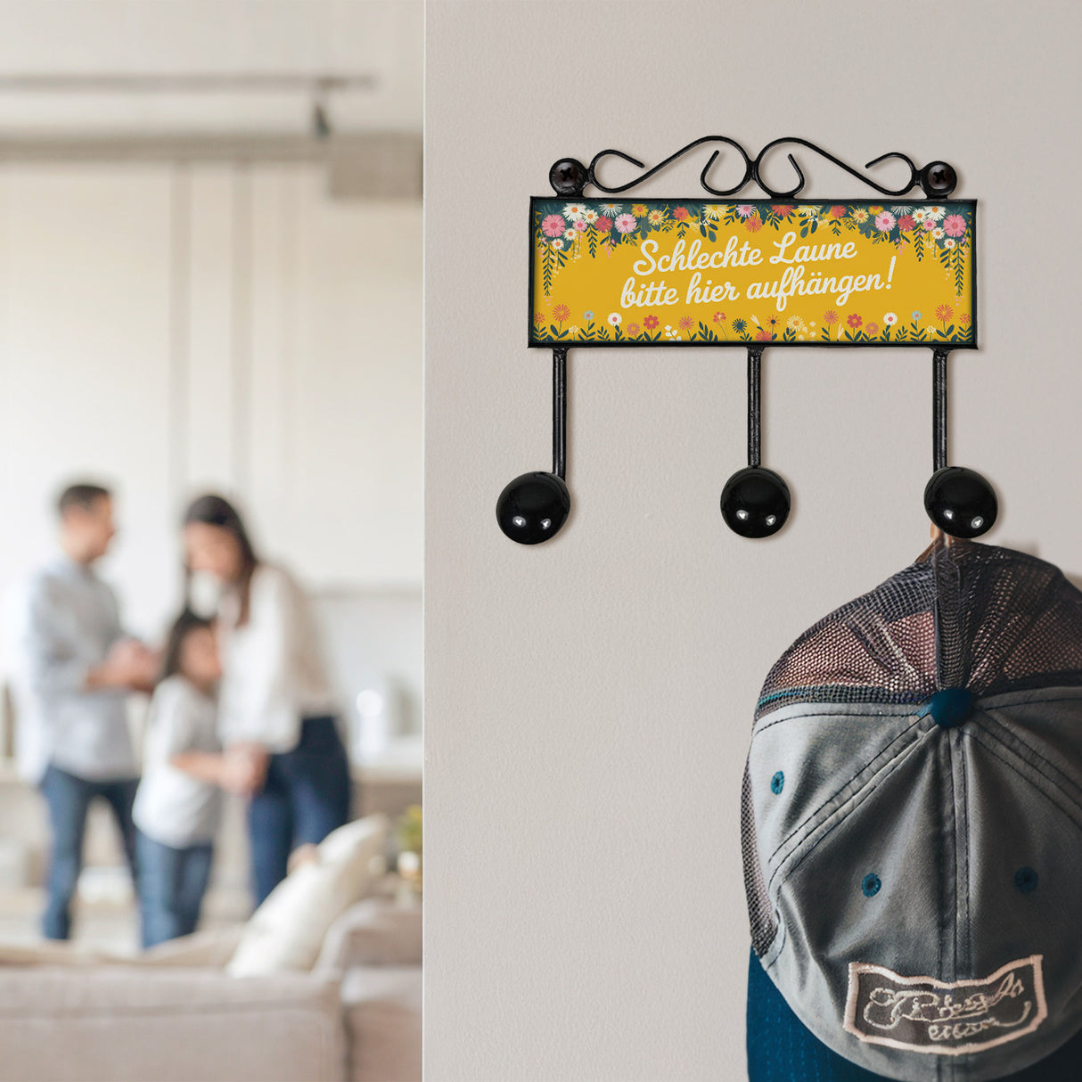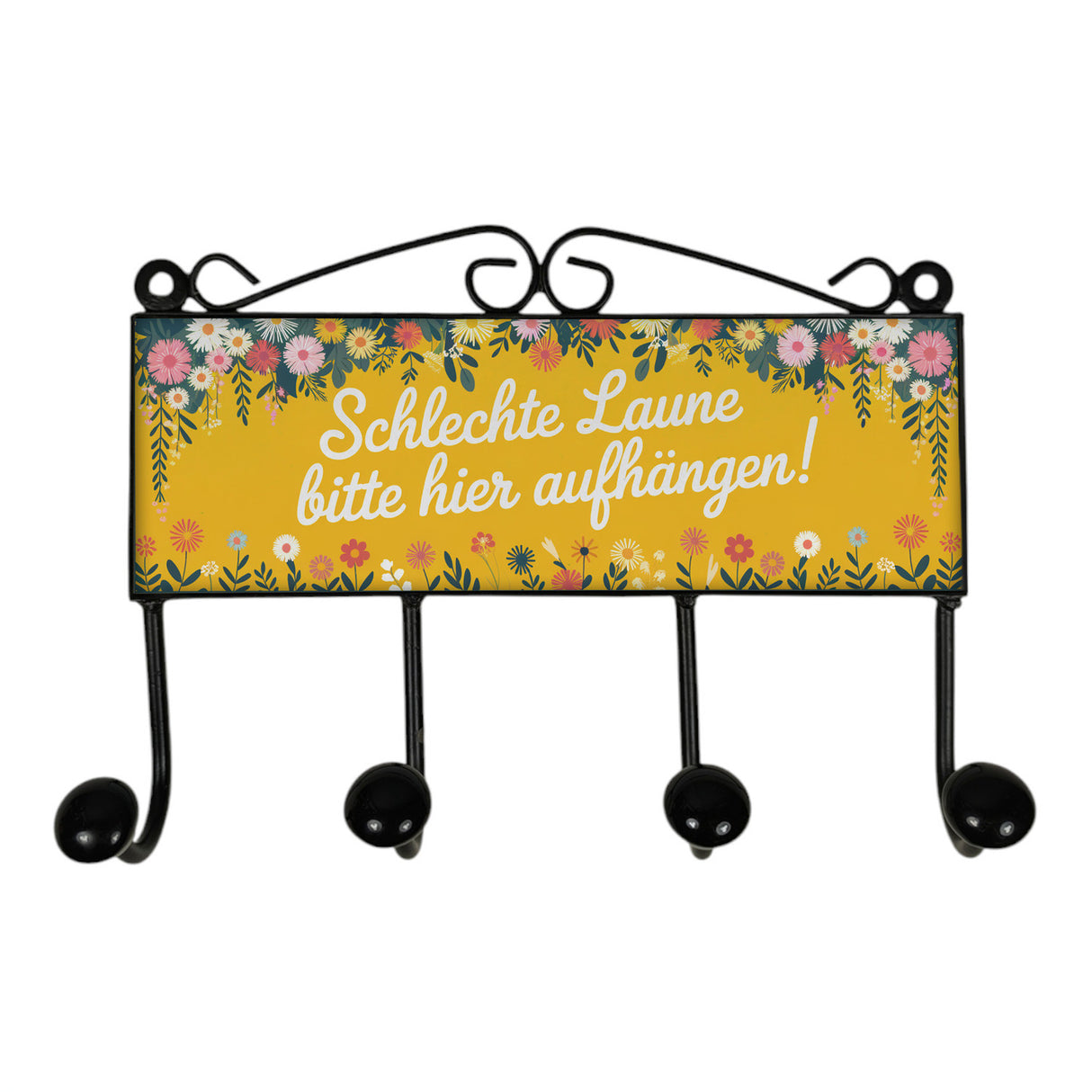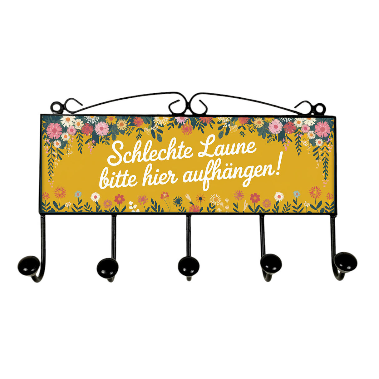 - Diese fröhliche Kleiderhakenleiste ist ein echter Hingucker! Mit ihrem leuchtend gelben Hintergrund und dem witzigen Spruch "Schlechte Laune bitte hier aufhängen!" zaubert sie jedem ein Lächeln ins Gesicht. Blumen, die von der Wand und am unteren Rand hängen, geben dem Design eine lebendige und einladende Note.